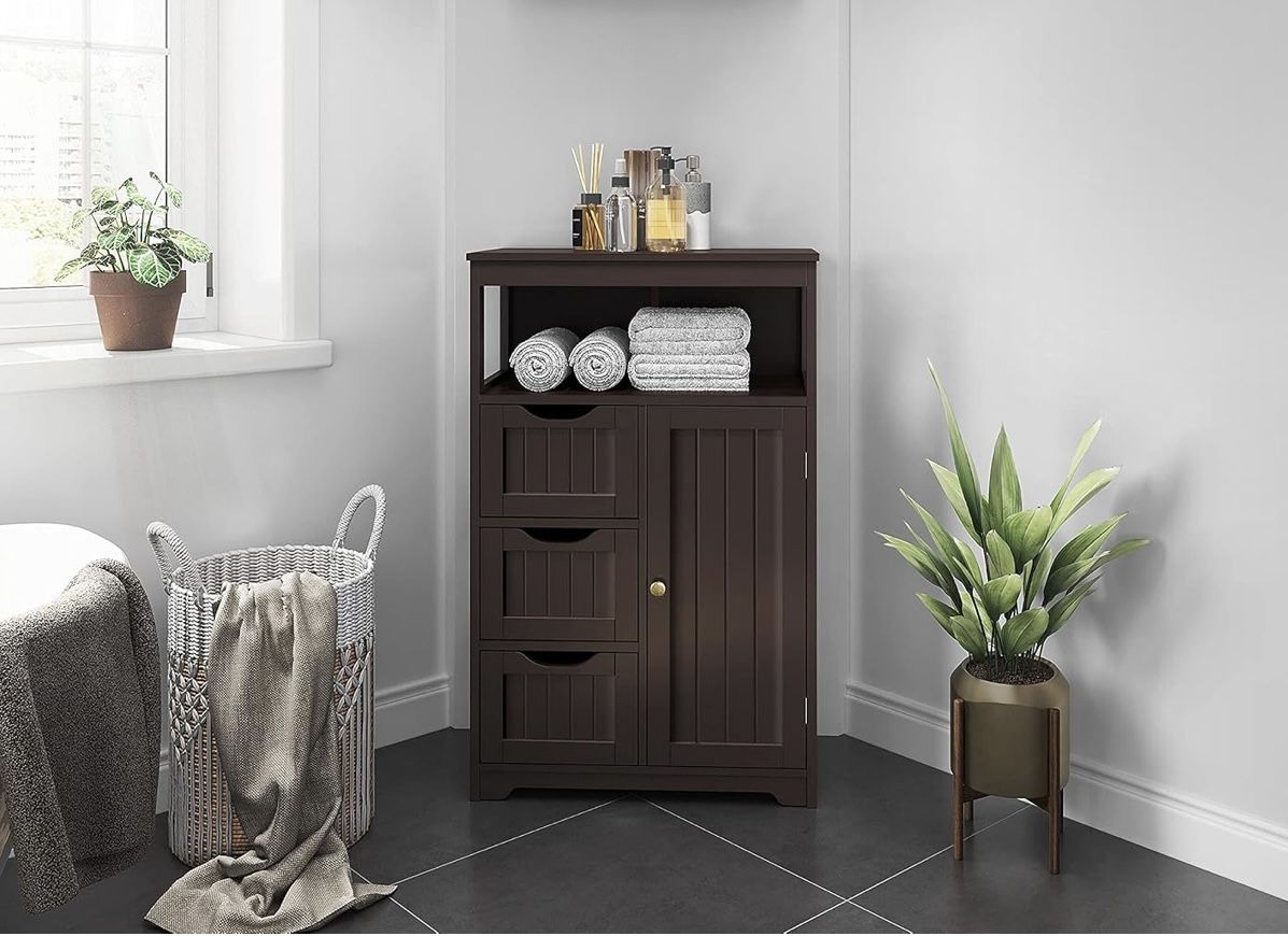 Wood Bathroom Floor Cabinet with 3 Drawers & 1 Cupboard, Free Standing Storage Organizer Hallway Entryway Cabinet for Living Room Kitchen, Espresso