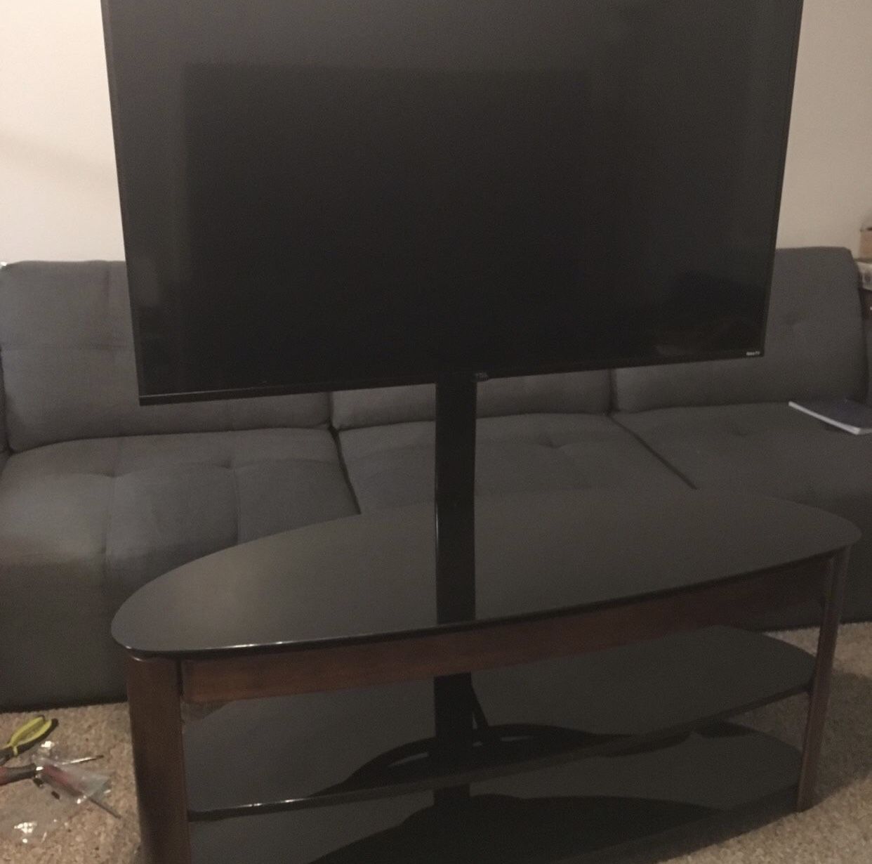 Tv stand that can hold up to a 60 inch TV Wood and glass Good condition/signs of normal use Feel free to make an offer!