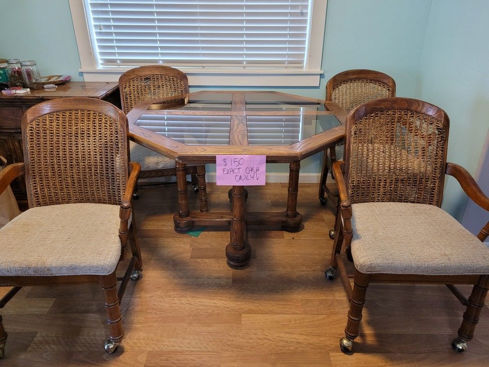 Glass Dining Room Table Set including: 4 Chairs on wheels Measurements = 4 FT x 4 FT Octagon x 30 Tall MUST SELL TOMORROW MORNING BETWEEN 830AM-11AM AUG. 2, 2025!!! Pick Up/Haul Away w/ Large Truck, Trailer, Van. Cash Only!! Gresham area