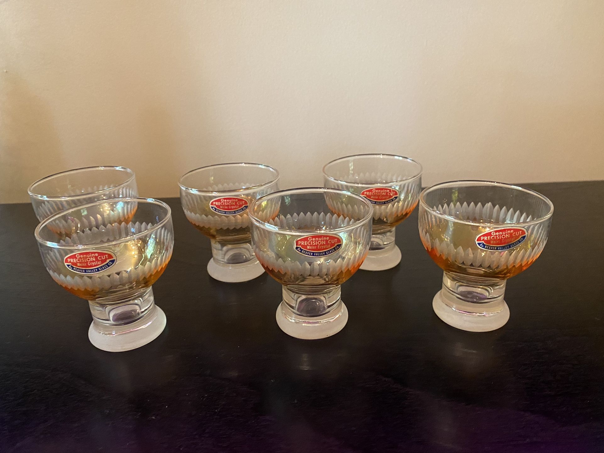 Six (6) Two -Tone Elegant Precision Cut Design by Meier Crystal Drinking Glasses with Frosted Bottoms - lite Gold. Made by Beaver Valley Glass Company Rochester, Pennsylvania. Produced in 1950-60’s. Unused- Paper Labels remain intact. 3” Tall - Capacity 2 Ounces