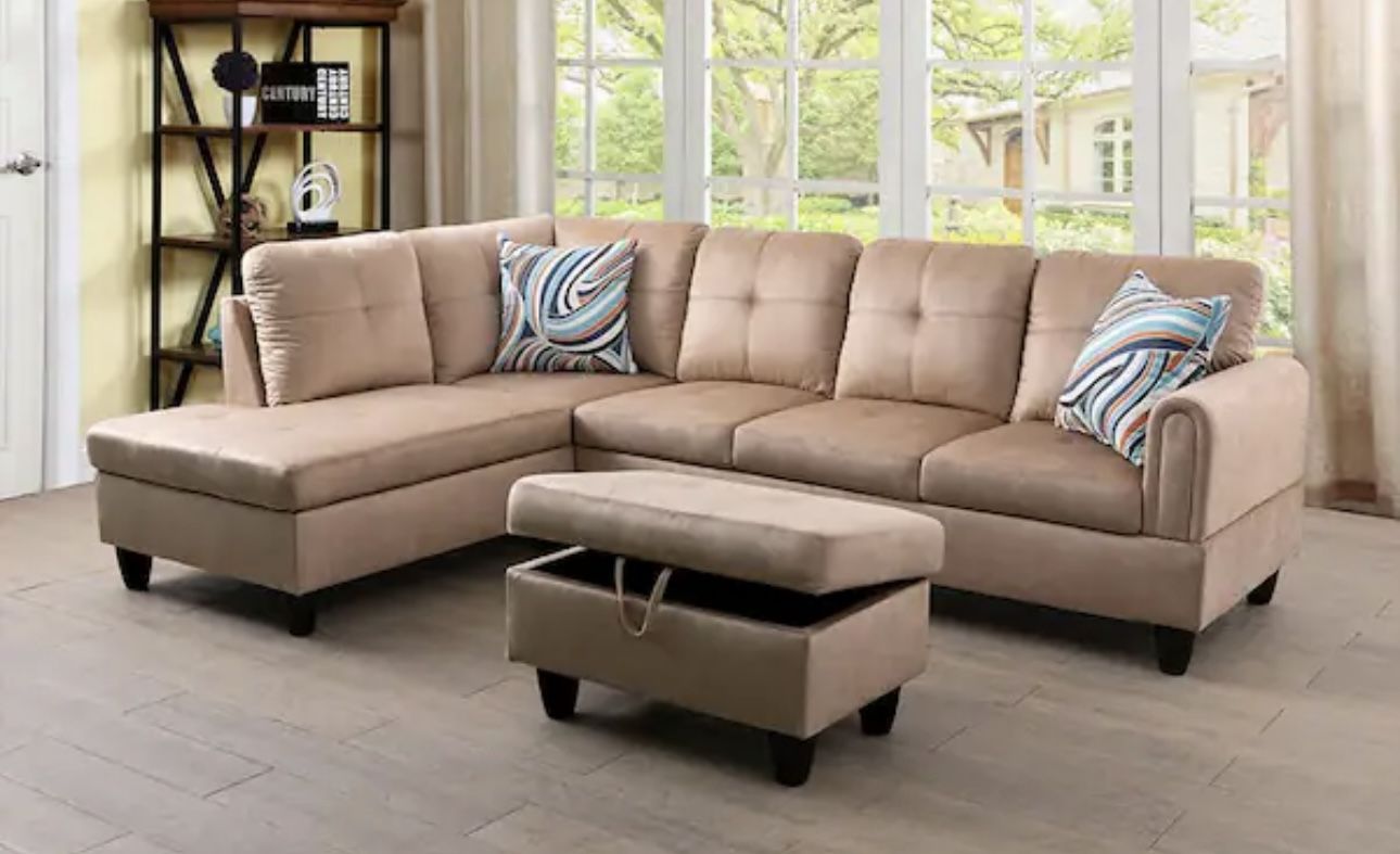 Sectional sofa couch and ottoman Brand new still in packaging this is display picture with decorative pillows and storage ottoman included Delivery to all areas