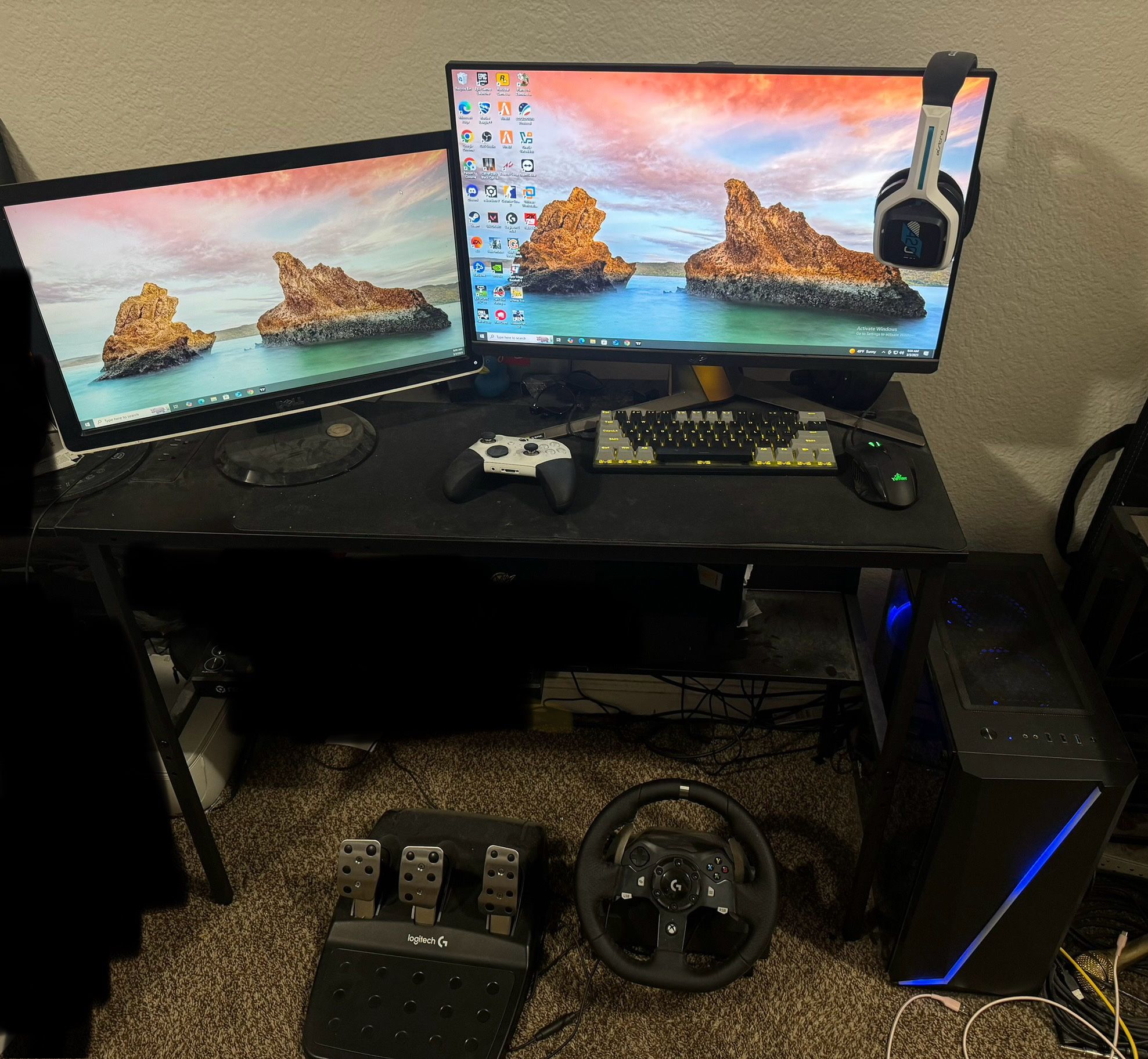Pc comes with Nvidia 3060ti AMD Ryzen 5 5600X 64gb of ram 2TB of space Keyboard and mouse Monitor Asus Rog Swift 360Hz 1440p Logitech g920 racing wheel comes with pedals and shifter Im asking for 1600 but if you would like to buy anything separate just shoot me a message for individual price