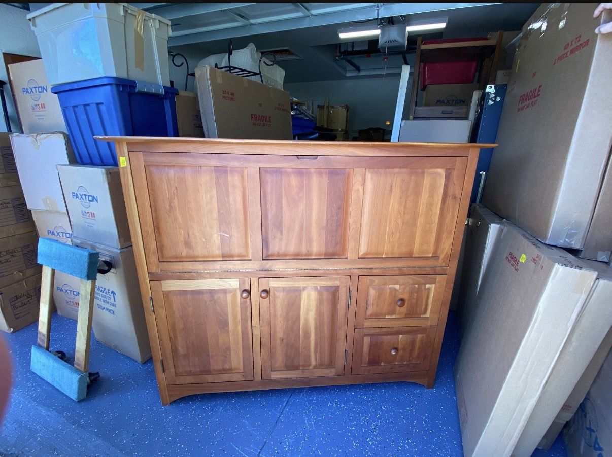 Solid cherry desk. Was great when we did not have an office. H: 51”. W: 23”. L: 60”. You pick up.