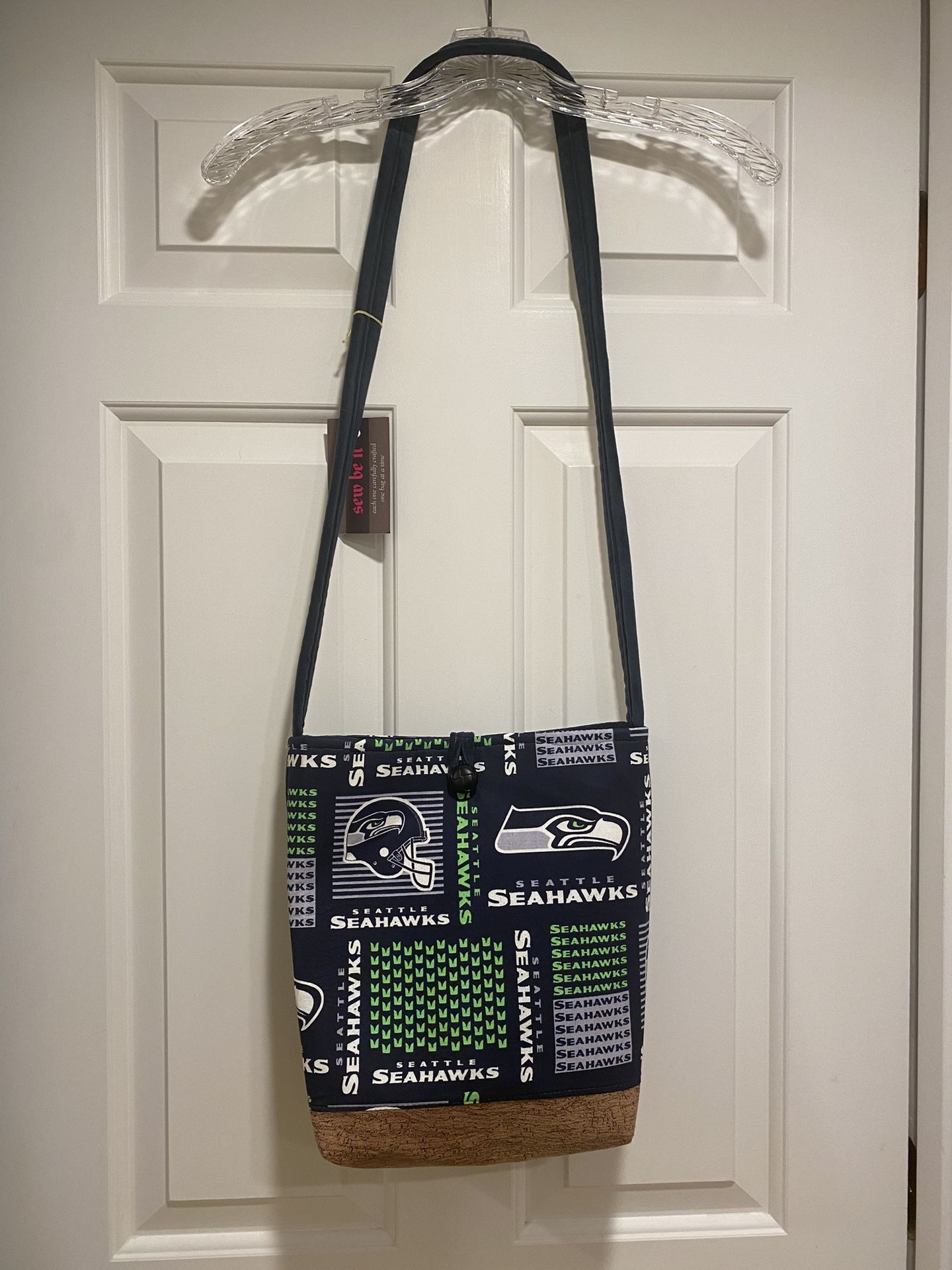 New with tag. Super cute, hand made crossbody purse. Made from cotton. Bought for a gift and forgot about it! Approximate measurements are 10” L x 10.5”W x 3”D. Please see pictures for measurements. It has two inside pockets. Button Closure. Meet at Issaquah IHOP parking lot-just off I-90. GO SEAHAWKS.