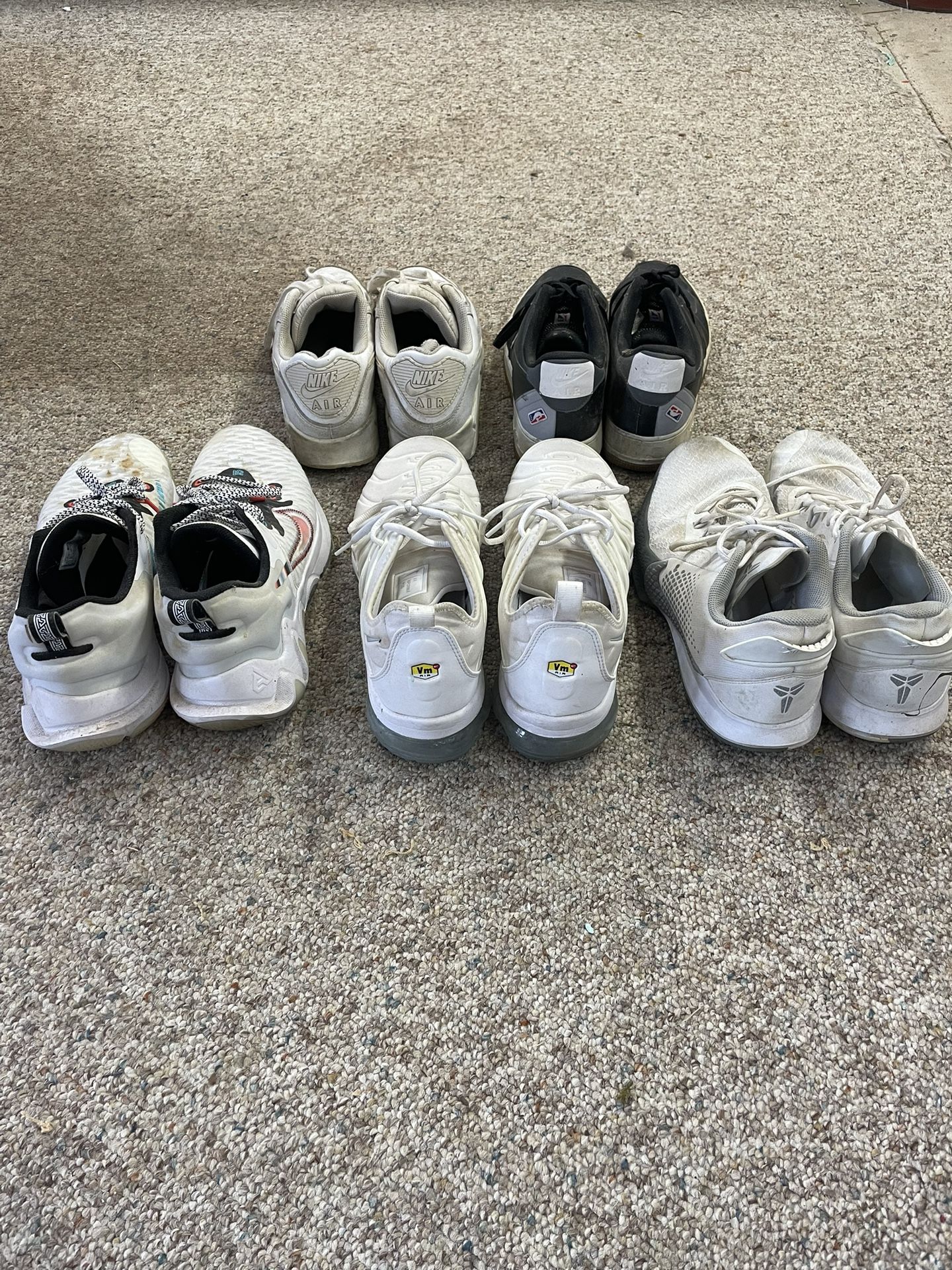 Various basketball shoes Price is for all 5 pairs Good tread left on shoes Some have scuffs and could be easily washed Black Nike Air CT2298 size 12 White Nike Zoom CK2087-100 size 12 White Nike Air Vapormax Plus 924453-100 size 12 White Nike Air Max CZ 5594-100 Size 12 Nike Giannis DH4470-100 Size 12.5