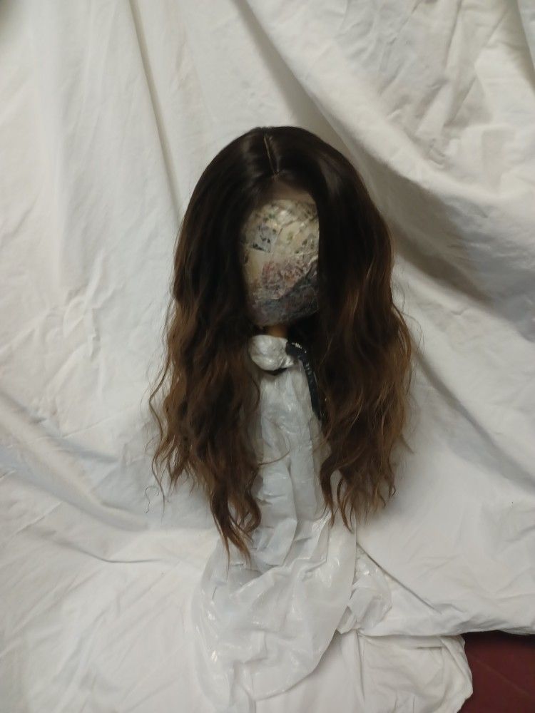 Brand new about 15 say 16 in Long lace front wig it's a two-tone maybe ombre dark with a lighter brown on the ends and never used brand new in the package
