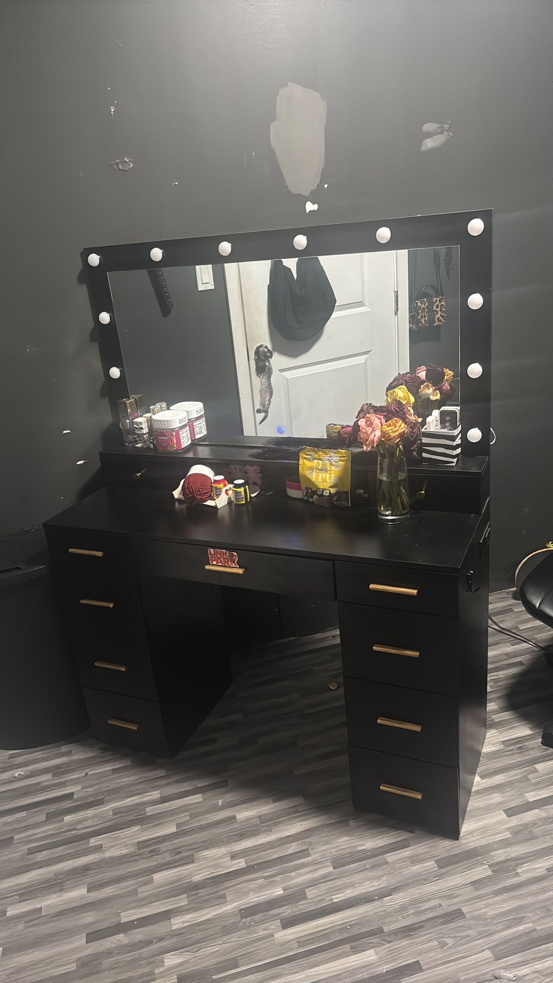 The lights don’t work so you guys will need to have to buy a new plug for the lights, but the button works and then one of the drawers don’t open and on the very bottom I use hot glue to make it stay in place witch last for months I suggest keep using hot glue for the bottom other than that, it’s in good condition the rest of the drawers work the outlet plug-in. I’m not sure how to make that work, but I think you guys have to put like batteries or something. Bc I never used it