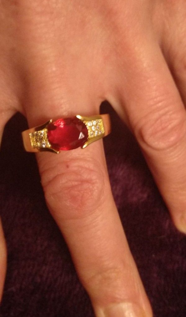 Men's/Women's Engagement Ring Size; 11 Color; RED/GOLD Material; 925 Sterling Silver under 18K Yellow GOLD Electroplating Stone; Cubic Zirconia- high quality Stone Weight; 2 Carat Stone Size; aprx 10mm Oval Ring Weight; 5.58g HypoAllergenic Pick-Up In Gladstone