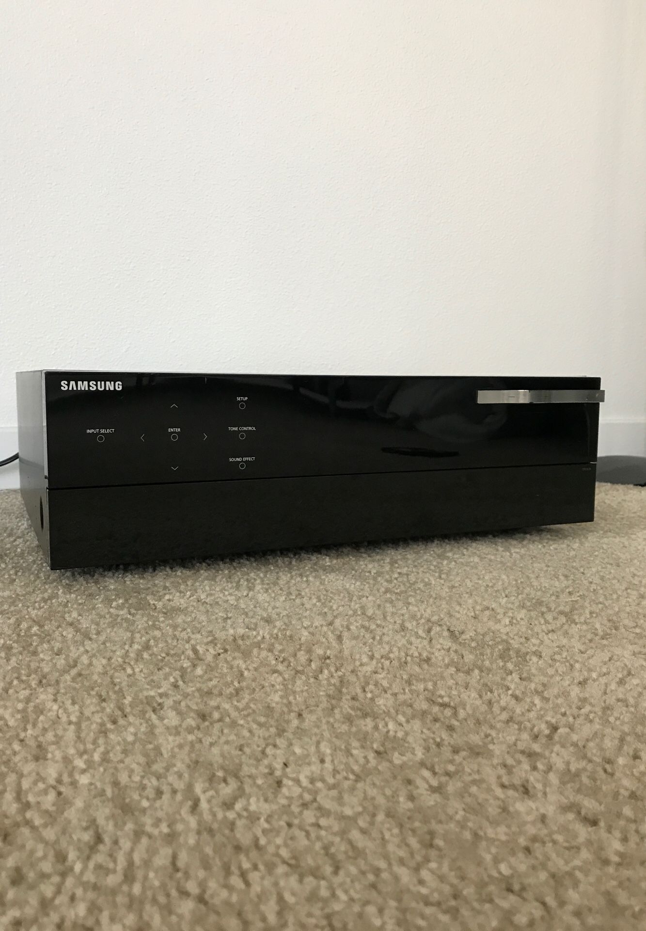 Piano black Samsung 5.1 surround sound HD receiver. Puts include 4 HDMI in, 1 HDMI out, 3 optical, 1 coaxial in, 1 coaxial out, 2 component in, 1 component out, 3 RCA video in, 1 RCA video out, 4 analog audio in, and 6-channel multi-chanel in, 6-channel speakers out. Original remote, surround set-up mic, and manual included. Price does not include S&H if not local.