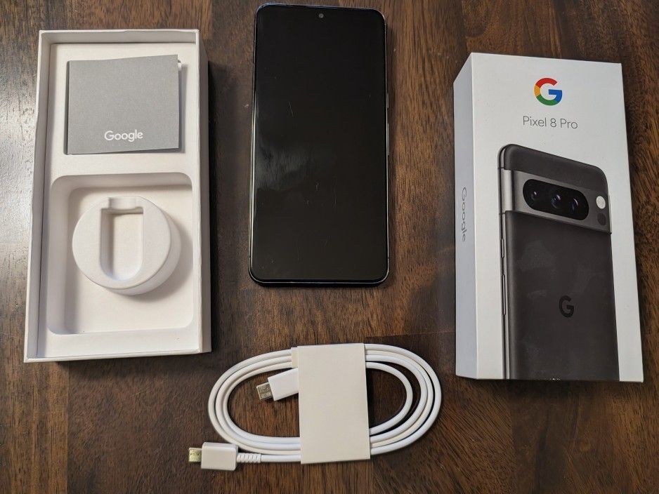 Used Google Pixel 8 Pro. Adult owned, non-smoker, minor light scratches from normal wear. Does not affect screen. No cracks to glass.