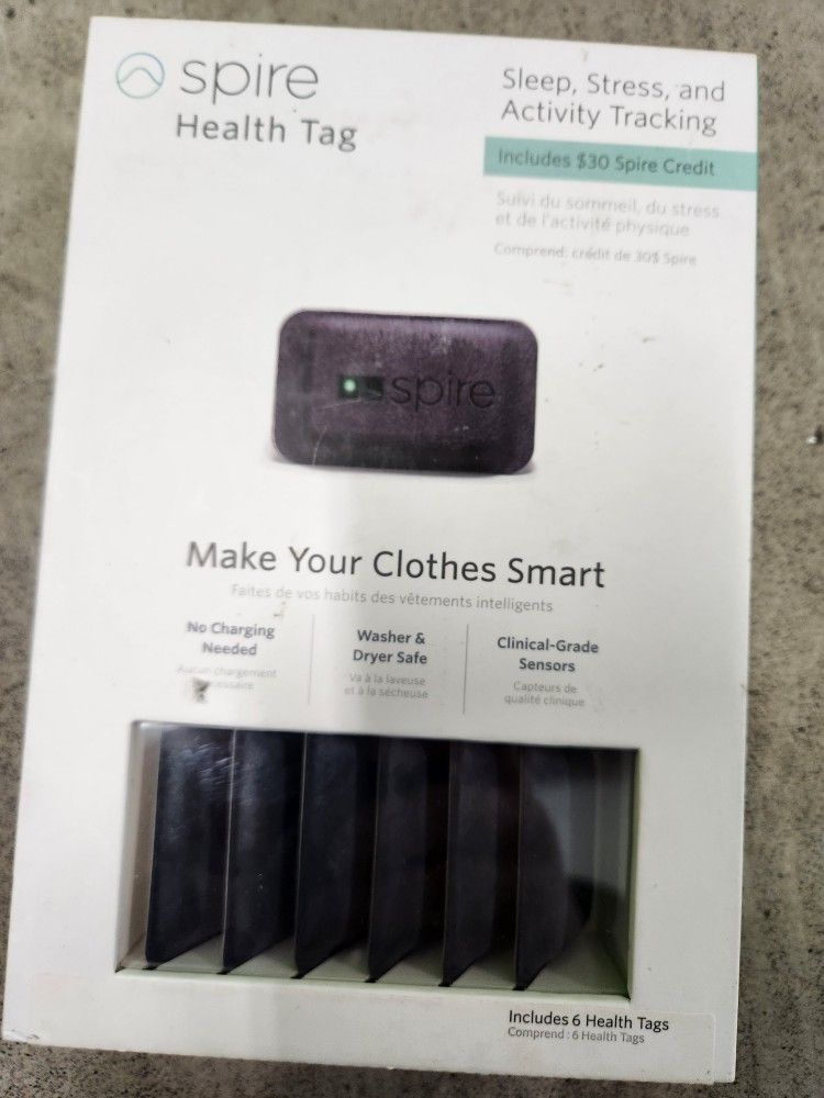 Brand new in box. Fast shipping. Product Description Meet the world's first no-hassle, intelligent health tracker Go beyond traditional health tracking with the Spire Health Tag. Sleep, stress, activity, heart rate, & more Understand how you sleep Our breathing sensors offer useful insights for improving your sleep Stop stress in its tracks Know when you are getting tense and take action before symptoms occur Track heart rate and workouts Track your heart rate, calories, steps and reminds you to be active A seamless part of your life "Set it and forget it" Health Tags are placed on your clothes, so you just get dressed and go Never charge your device again Health Tags never need to be recharged. When you join Spire+ we'll replace them for free Washer & dryer safe You can just toss your clothes (with Health Tags on them) in the laundry as you normally would How does it work? Attach Health Tags to your clothes once – and forget about them Unpack your Health Tags Tag clothes you wear most like bras and underwear Just get dressed and let Health Tags keep track of your health Get your personalized daily insights Health Tags work with our free iOS companion app to track your progress 24/7 and provide actionable insights and recommendations Research-backed technology Spire’s technology is backed by 7 years of research from Stanford University. Our comprehensive, clinical-grade sensors continuously monitor respiration, heart rate, activity, and sleep In the Box Spire Health Tag Fitness Tracker - 8 Pack