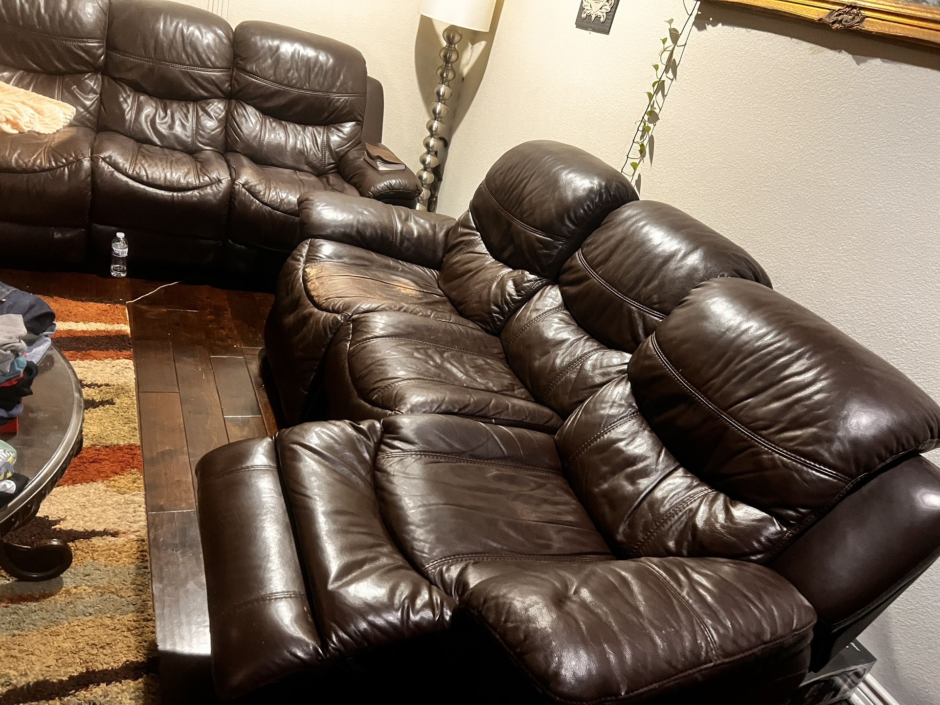 Leather sofa with 4 seat power reclining. Works perfectly fine. Color fade on 2 seats