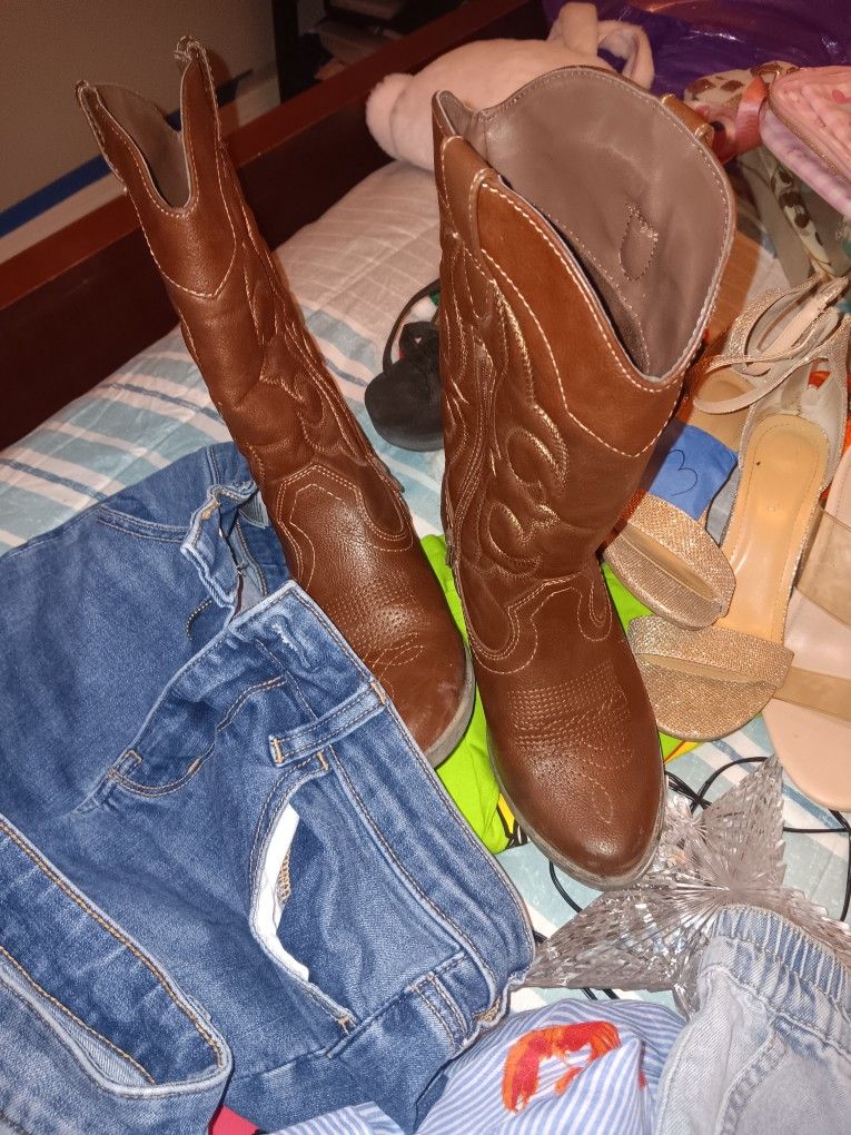 Una bolsa de ropa, botas size 6,zapatillas size 6y7 y otros accesorios todo por 30 dólares