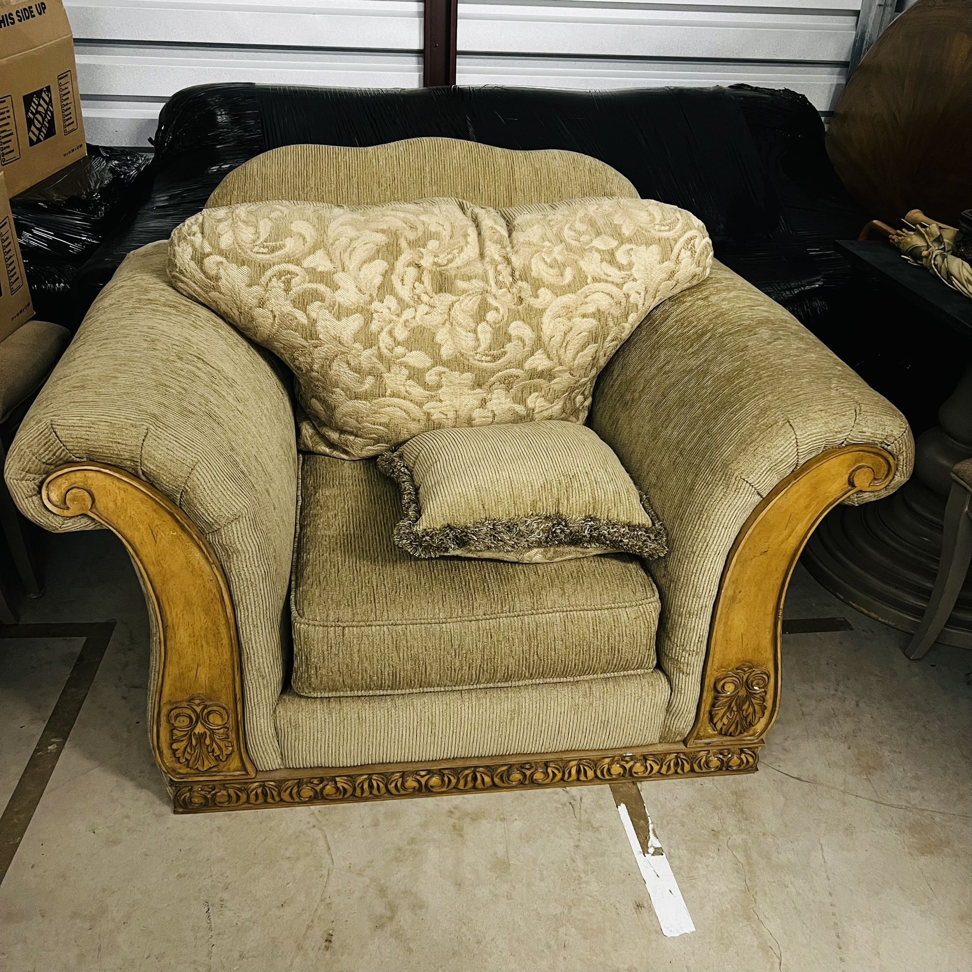 This is a traditional-style fabric armchair with carved wood accent Pet and smoke free environment