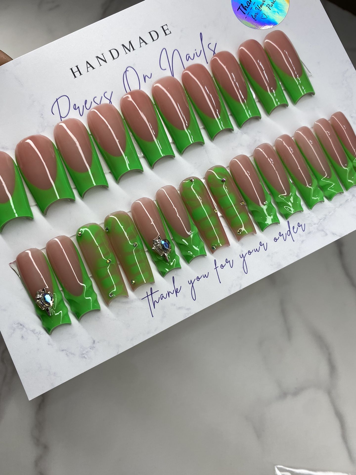 These are a long square set handmade and very durable. They will last you up to two weeks or more and can be reused. This set comes with 24 nails (two of each nail size) And a nail prep kit. For more details feel free to ask Checkout my instagram for more Nailswithadriana