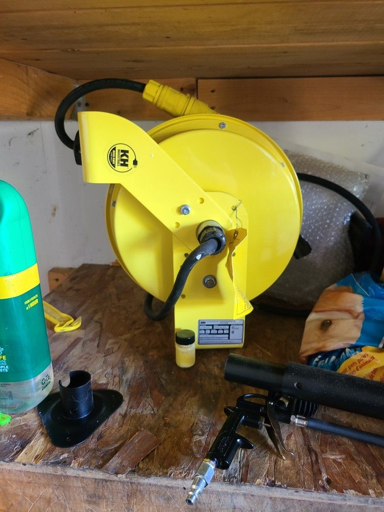 Retractable power reel never used brand new with touch up paint !! 50 ft adapter plug as well 600volt 20 amp 12000watt 12/3 wire offer today asking 1200 today original price 1700