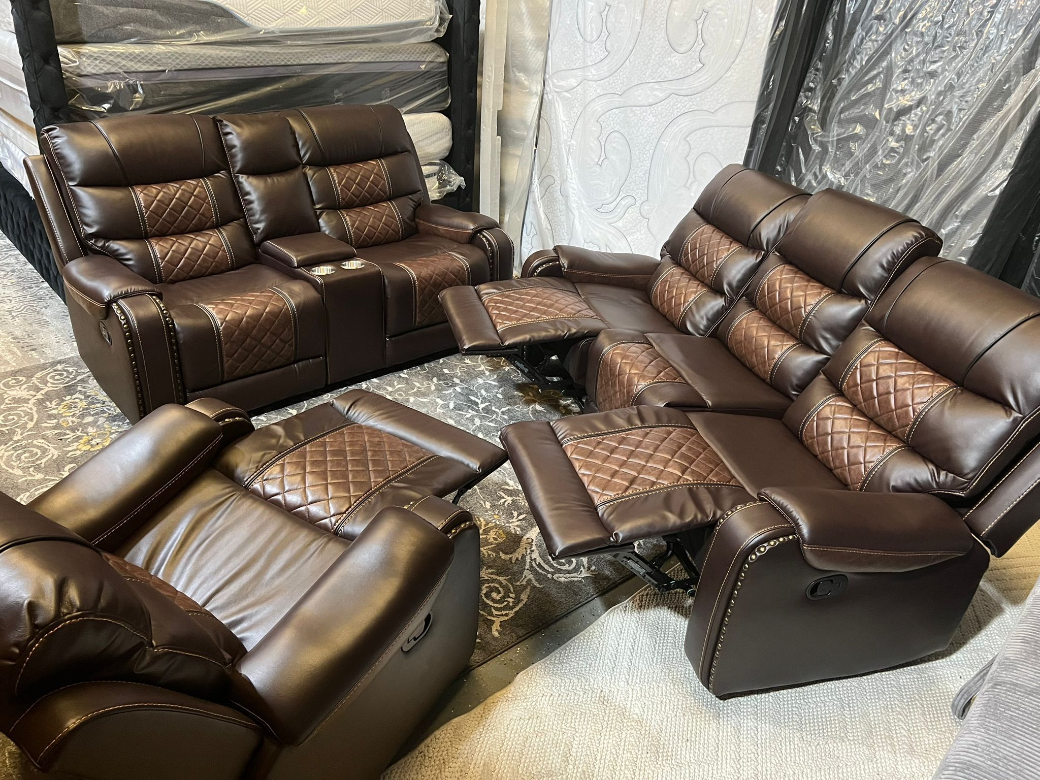 CLEARANCE SALE ONLY $1349! BRAND NEW IN THE BOX Material: Leather Gel Color: 2TONE BROWN Description: Recliner Sofa with Drop Down Cup Holders and 110v Power Outlets and USB Outlets Recliner Loveseat with Cup Holders and Storage Consol Recliner Gliding Chair SOFA- 86L X 39.5D X 40H LOVESEAT- 77L X 39.5D X 40H GLIDER RECLINER- 40L X 39.5D X 40H Same Day Delivery & Setup Available! EZ Financing! ONLY $32 Down! 0% INTEREST!!! Check it out in person today !! Empire Appliances & Furniture 6340 North Freeway Houston, TX 77076 Mon-Sat 10AM-7PM Sunday 12PM-6PM CALL OR TEXT TODAY 7139029691