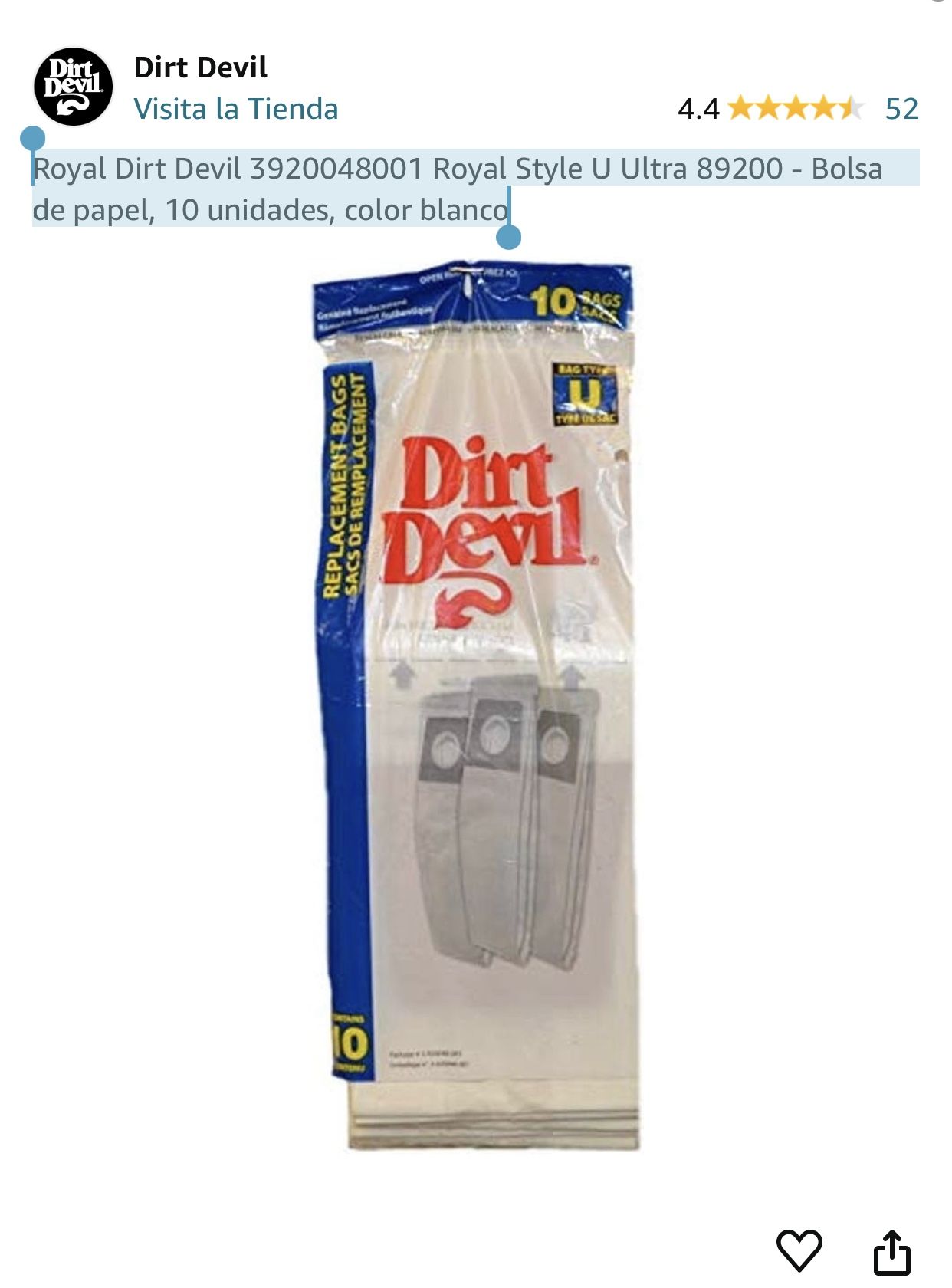 Dirt Devil Type U Paper Bags, Royal Style U Ultra 89200 Part (contact info removed)001 10 bags sacs type U