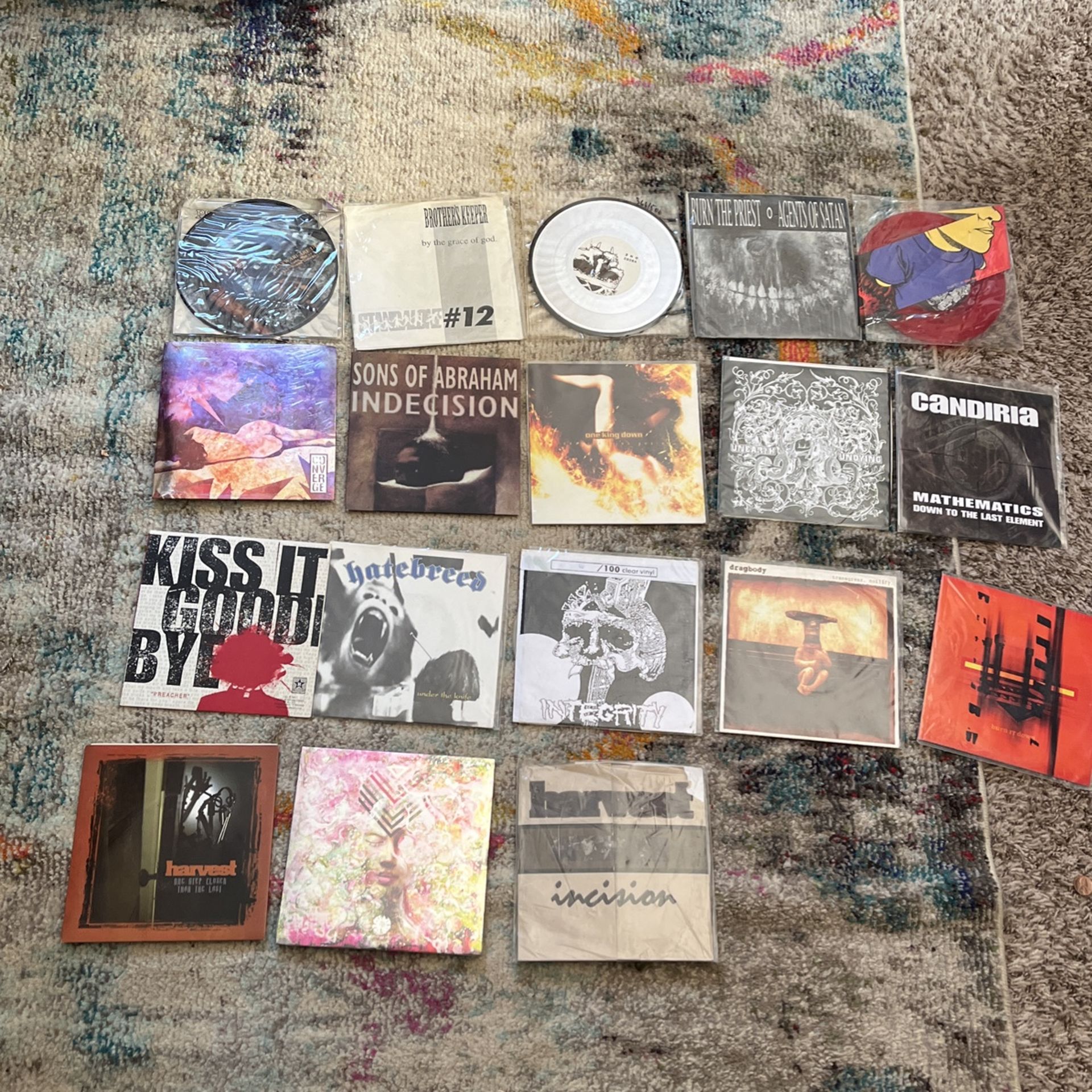 7” records I have and see if you are interested in them. Here goes. Integrity/Psywarfare split picture disc 7” Brothers Keeper - By the Grace of God 7” Integrity/Lockweld 7” silver # 366/500 Burn the Priest/Agents of Satan split 7” Shai Hulud/Boy Sets Fire -Crush ‘em All split 7” red vinyl Converge - I can tell you about pain 7” unopened Sons of Abraham/Indecision split 7” One King Down - Gravity Wins Again 7” Unearth/Undying split 7” Candiria - Mathmatics 7” Kiss It Goodbye - Target Practice 7” Hatebreed - Under the Knife 7” (smorgasbord records) Integrity 7” Victory Records VR75 clear vinyl 60/100 Dragbody - Transgress/Nulify 7” Burn It Down - 7” Revolution 6 Harvest - One Step Closer than the Last 7” Converge - Live at the BBC 7” unopened Harvest - Incision 7” cover and sleeve are slightly damaged in the corners but the record is flawless. All of the above records were purchased by me years ago and have never been played as I’ve never owned a record player. If you are interested please let me know and thank you for your time. Pickup or meet up only.