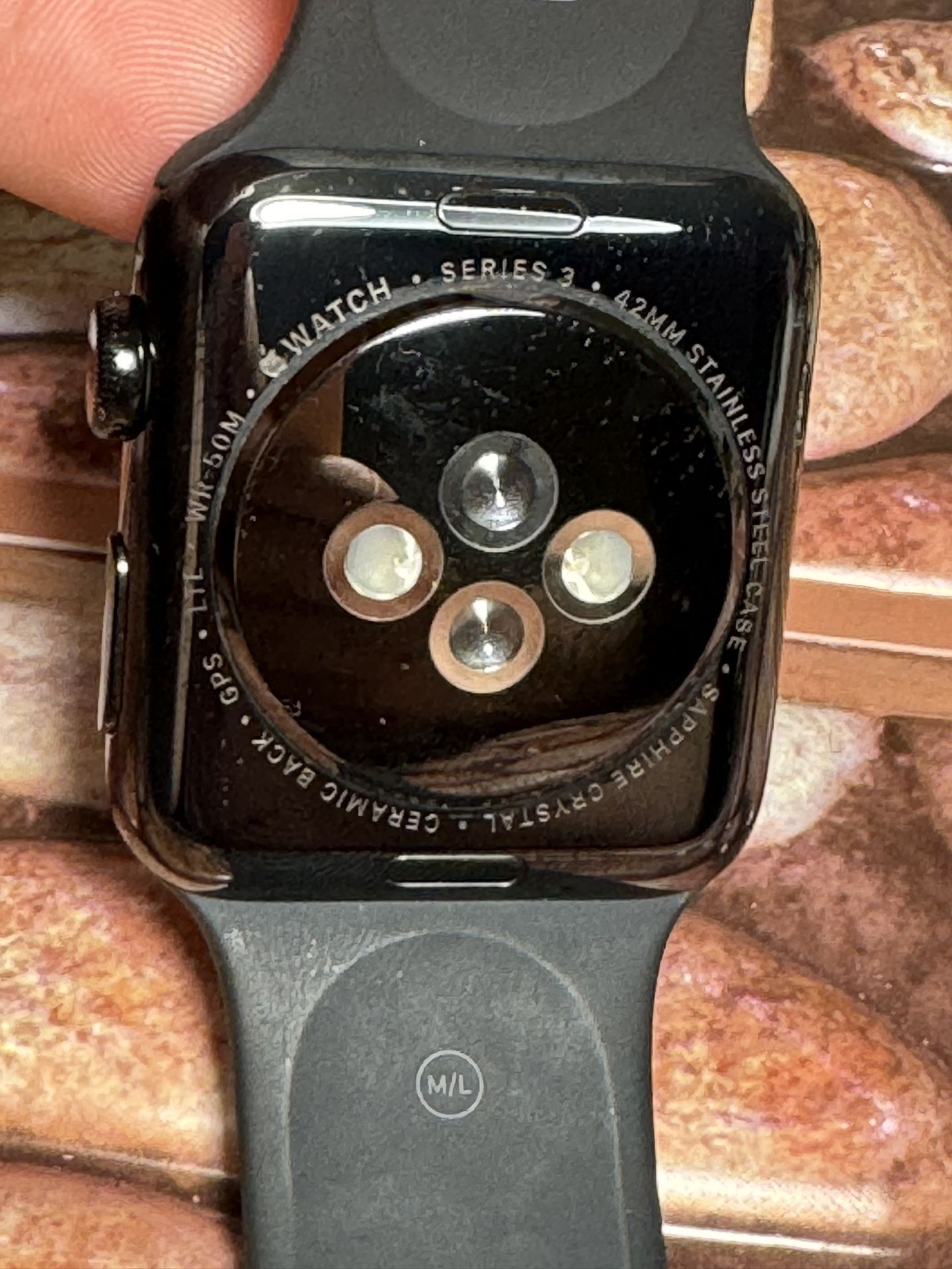 Apple Watch Series 3 42mm Stainless Steel Space Gray GPS + Cellular. Cames with OEM black sport band + magnetic charger and 4 extra bands! Fully functional! Features GPS, GLONASS, Galileo, and QZSS Altimeter Water resistant 50 meters1 Optical heart sensor Emergency SOS Accelerometer up to 16 g-forces Gyroscope Ambient light sensor Speaker Microphone Apple Pay GymKit Capacity 16GB GPS + Cellular Capacity 8GB Ceramic and sapphire crystal back (center) GPS + Cellular Stainless Steel case - 42mm Height: 42.5mm Width: 36.4mm Depth: 11.4mm Case Weight: 52.8g