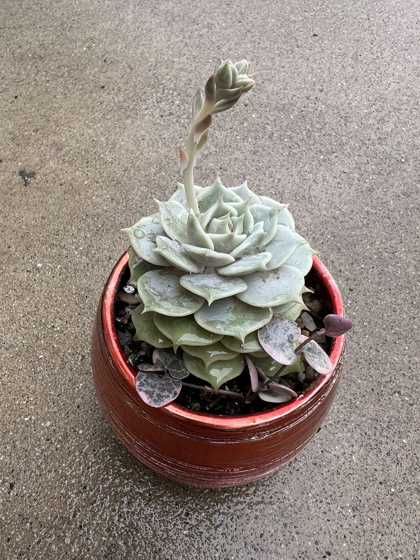 Echeveria lola and variegated string of hearts succulent in red pot with drainage hole 4” pot