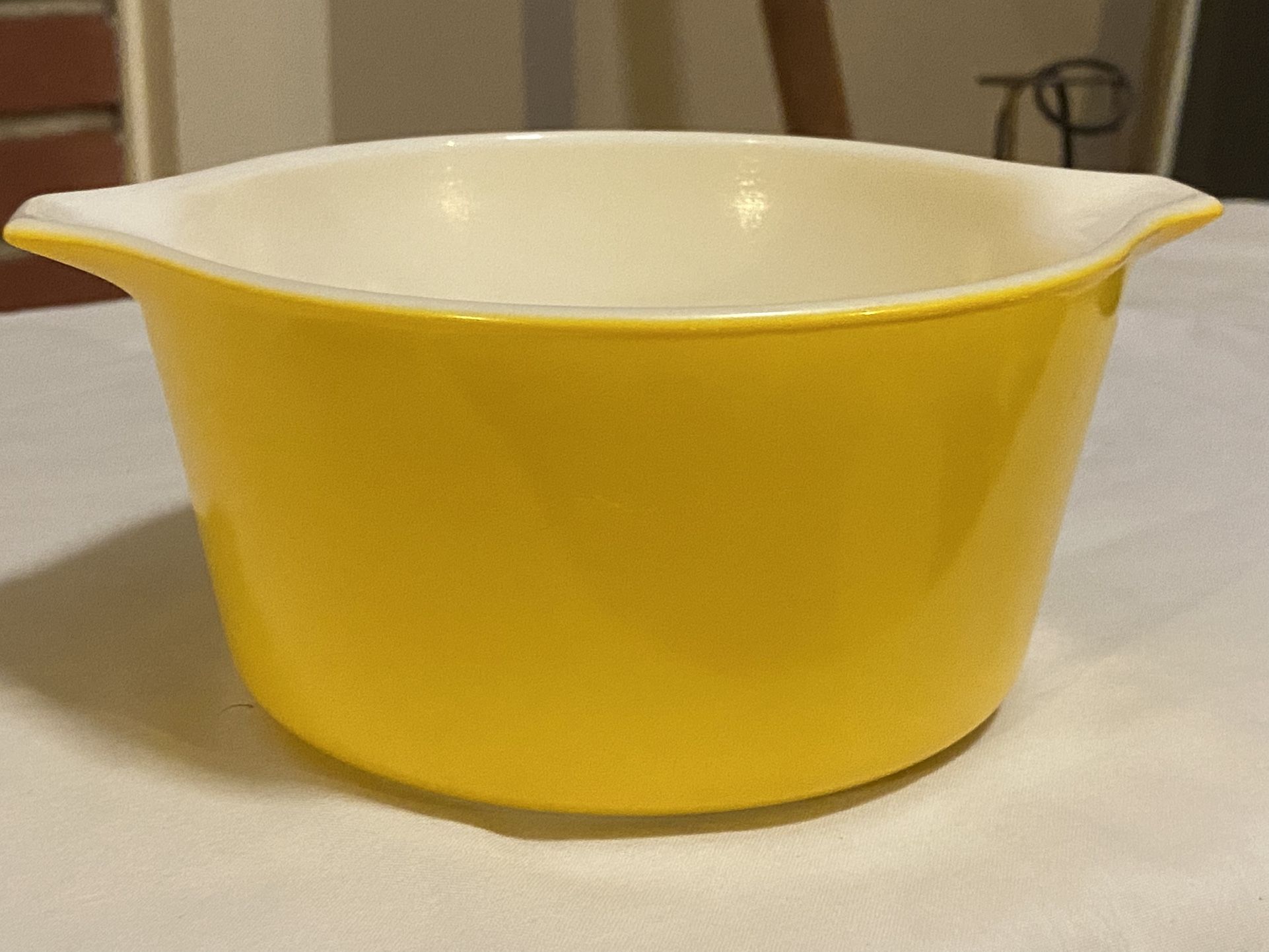 Vintage Pyrex 483, casserole. Made in the USA. Lemon yellow casserole is 6 in diameter ,3 inch high,and has Cinderella handles. This is 1-pt. This round dish has a glossy finish and is part of Pyrex's Cinderella line. This item is in good condition.
