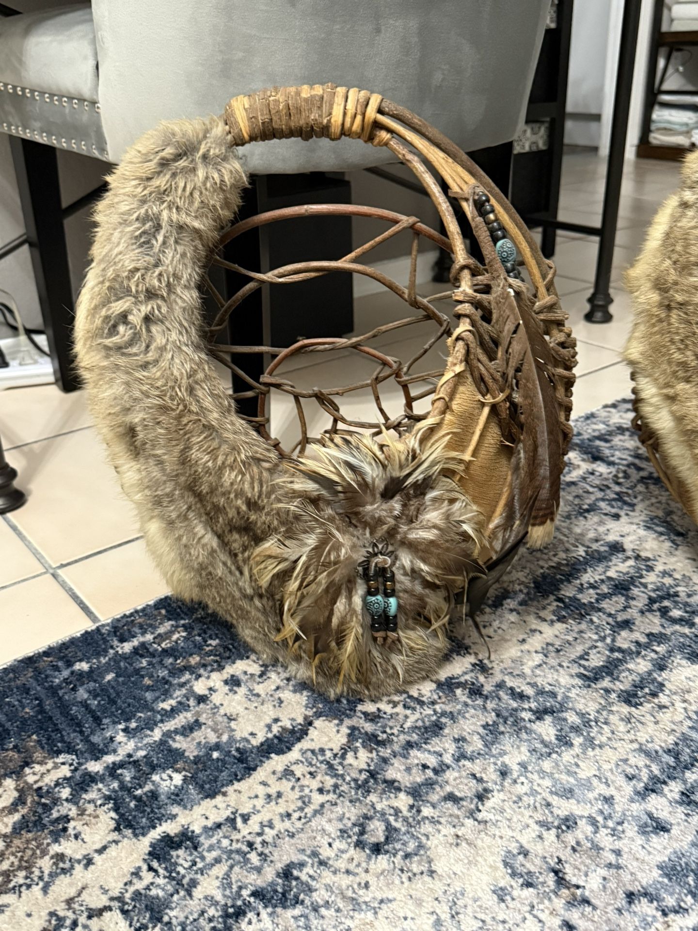 Handmade, with real fur, feathers and turquoise beading matching pair.