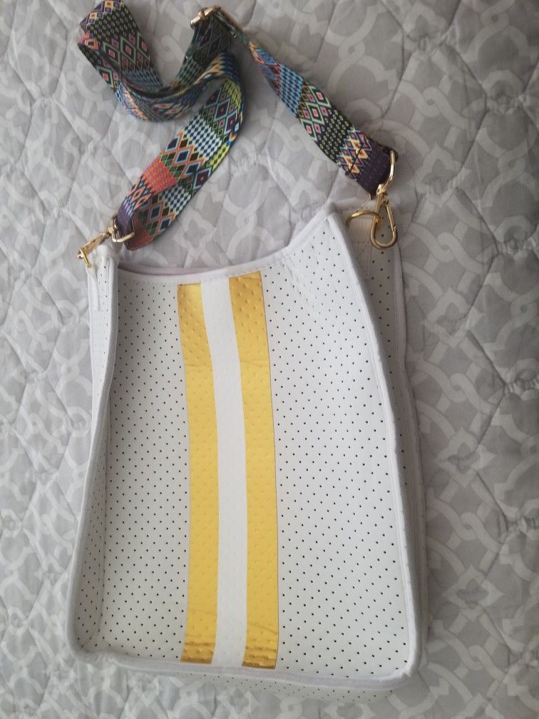 ** Brand New** - Metro Industry messenger bag made of stylish washable neoprene material measuring 13 in., 13 in. wide. and 1 in. deep. - White color with inter-changeable straps.