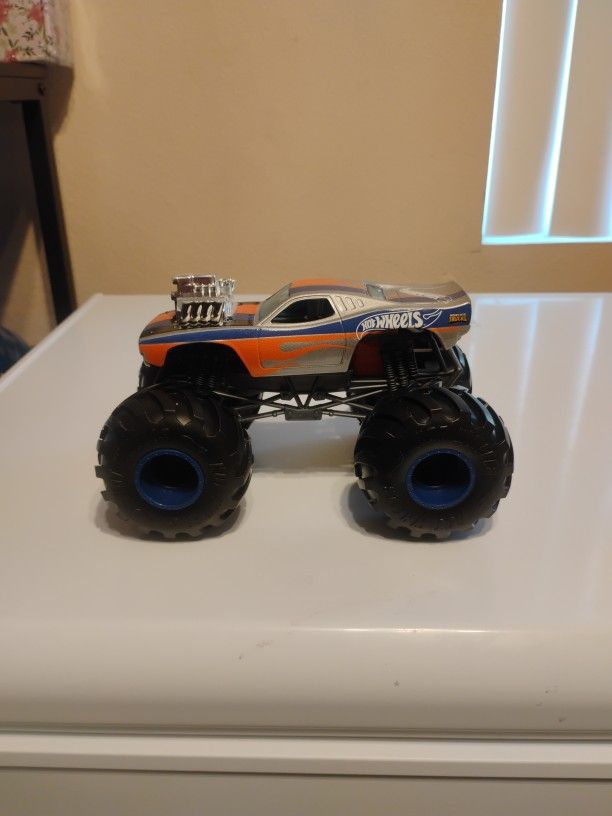 Inspired by Dodge Charger 1973 SE Features orange & blue chrome Giant Wheels Die cast car monster truck