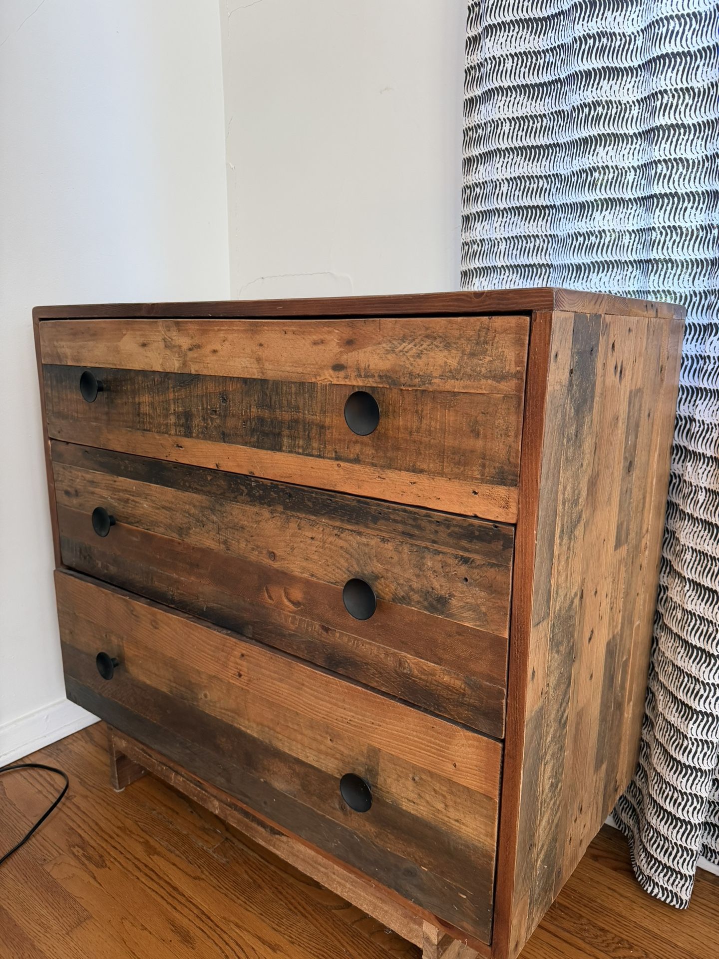 Rustic West Elm, reclaimed wood dresser. Dresser features three drawers. Measurements are 18 inches in depth, 3 feet length and 35 inches in height