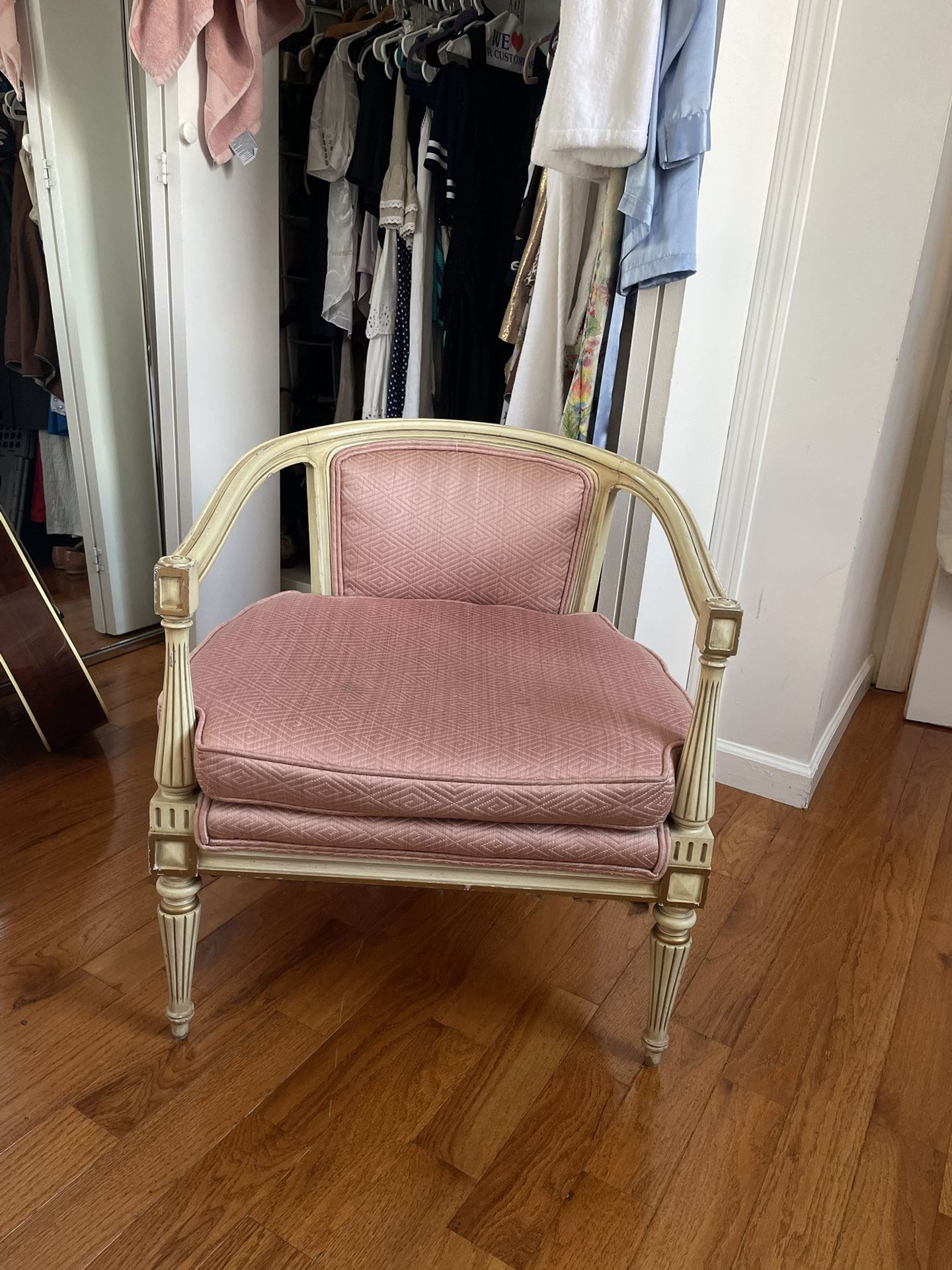 Vintage light rosy pink cushion chair very comfortable and beautiful and princess like. Small stains on cushion as you can see in one of the pictures but could be taken out probably. Could be used as vanity seat or just a nice accent chair. Make an offer! Pick up in Chinatown 5 flight walk up Back of chair is 26” tall, the seat is about 24” x 18”, and the height from the floor to the top of the seat cushion is 15”