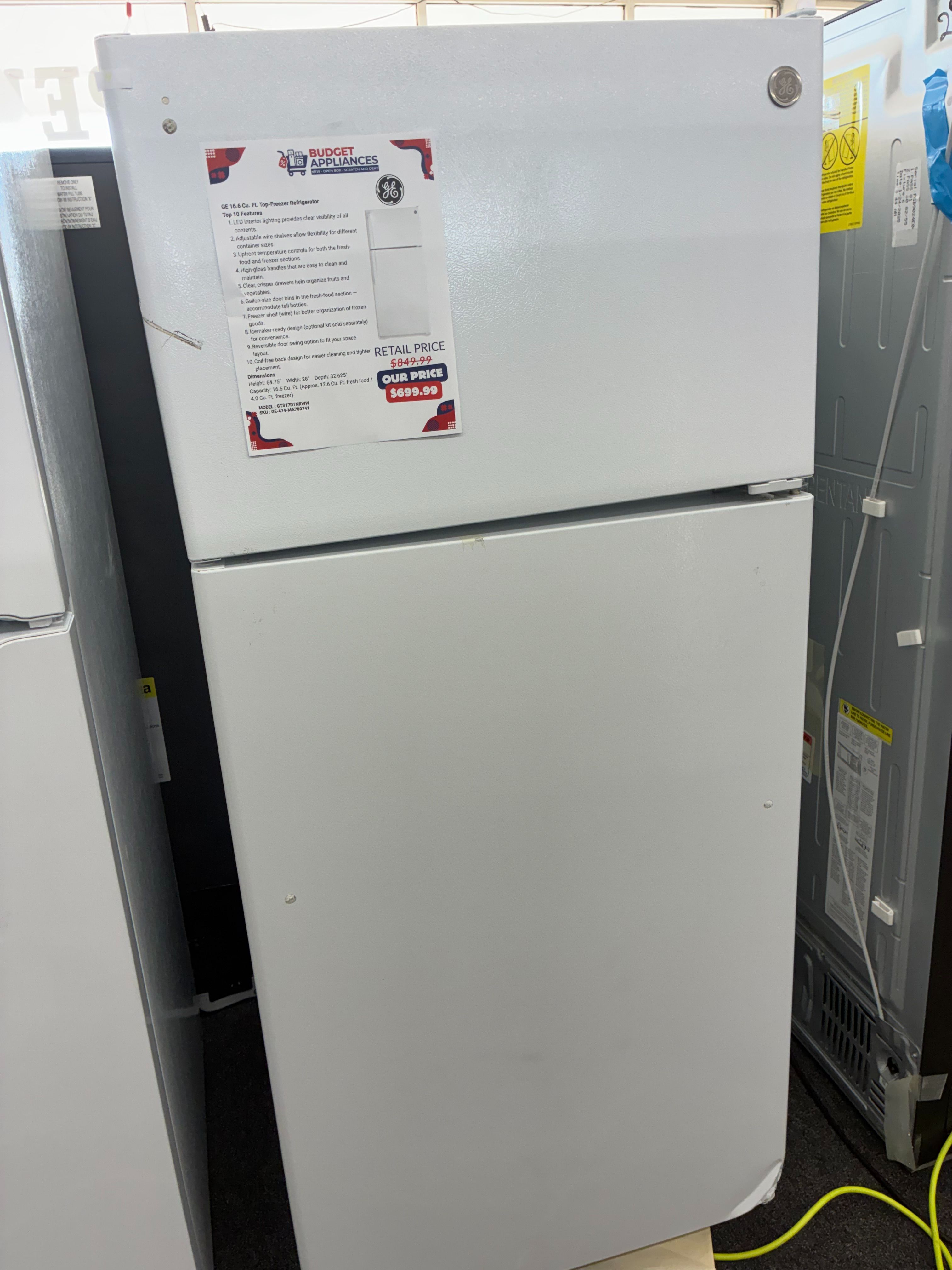 TOP 10 FEATURES 1. 16.6 Cu. Ft. Total Capacity – Compact size with efficient storage for everyday groceries. 2. LED Interior Lighting – Bright lighting helps you easily locate food items inside the refrigerator. 3. Adjustable Wire Shelves – Moveable shelves allow flexible storage for taller containers. 4. Upfront Temperature Controls – Easy-to-reach controls regulate both refrigerator and freezer temperatures. 5. Clear Crisper Drawers – Keeps fruits and vegetables organized and fresh longer. 6. Gallon Door Storage – Large door bins hold milk jugs and big beverage containers. 7. Dairy Compartment – Dedicated storage space for butter, cheese, and small items. 8. Frost-Free Defrost System – Prevents ice buildup and eliminates manual defrosting. 9. Optional Ice Maker Ready (IM4D) – Can add an ice maker kit if needed. 10. Reversible Door – Door swing can be adjusted to open left or right for flexible installation. DIMENSIONS Height (to top of hinge): 64 3/4 in Width: 28 in Depth (with handle): 32 5/8 in Depth with door open 90°: ~57 in Total Capacity: 16.6 cu ft Refrigerator Capacity: 12.6 cu ft Freezer Capacity: 4.0 cu ft Weight: ~152 lbs
