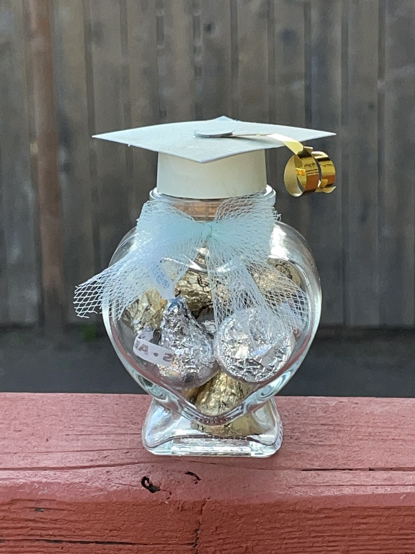 Heart shaped glass jar filled with Hershey kisses. I make them, they can be customized π