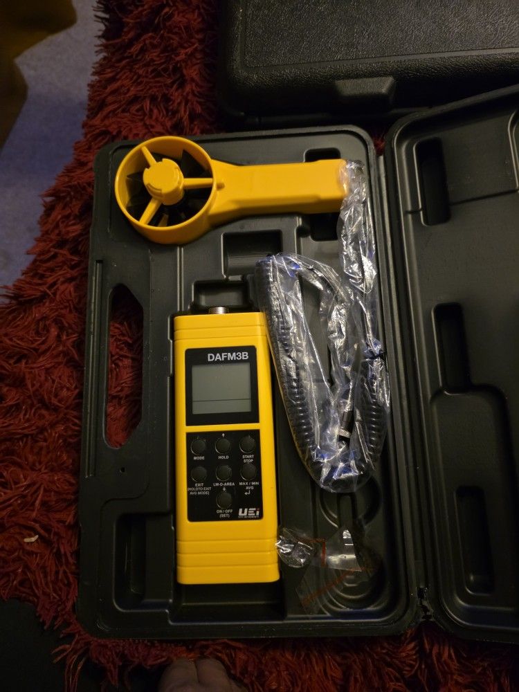 The pictured device is a UEi DAFM3B Digital Anemometer/Psychrometer. It's a handheld tool used for measuring HVAC/R parameters. Key features include: Measures air velocity, temperature, and humidity. Calculates wet bulb, dew point, and air volume (CFM, CMM). Features a remote vane for accurate readings. Offers up to one hour of accumulative average. Has both Metric and English scales. Includes a protective twist cap for the sensor.