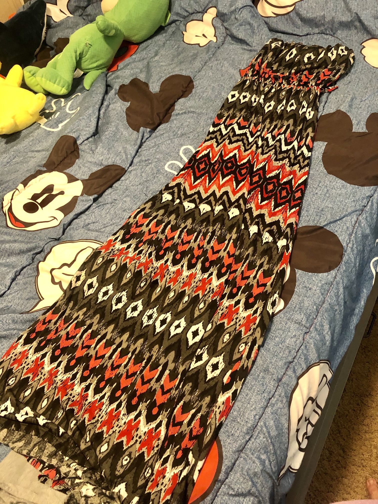 Size small, could fit xs Euc Black, grey, white, hot pink multicolored Strapless, floor length, loop on the side to add a belt