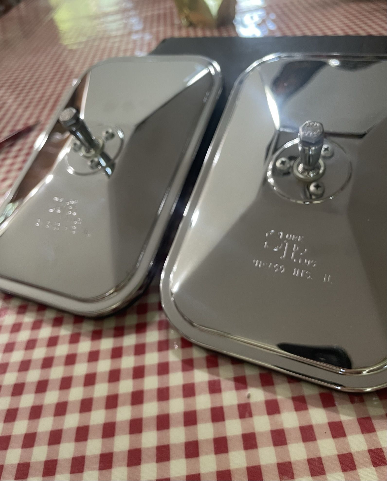 King of the Road, Sure Plus of Chicago Heights, IL Stud Mount Replacement Mirror Heads. 5 1/2” x 8 1/2” ballstud. Model 310 as listed on Sure Plus website. 2 Replacement Mirror Heads for $20. Both are new in box, chrome looks excellent.