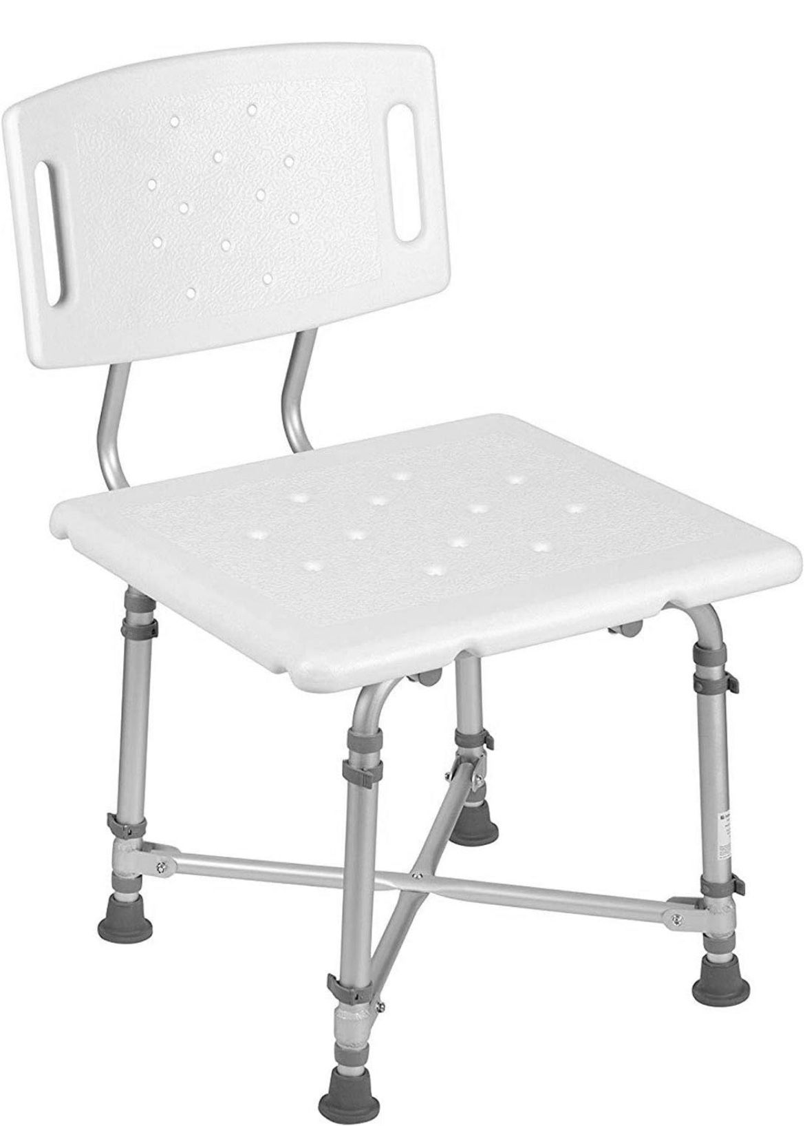 Top Highlights Brand DMI Material Aluminum Color White Item Weight 13.5 Pounds Product Dimensions 20"D x 21"W x 23"H Maximum Weight Recommendation 500 Pounds SHOWER CHAIR FOR BATHTUB provides comfort and safety in a bath chair that was designed to complement and blend into bathroom decor while providing a stable place to sit during a shower or bath. BATH SEAT is safe and secure with a frame constructed of strong lightweight anodized aluminum, and can accommodate up to 500 pounds with slip resistant tips for firm footing on wet surfaces. SHOWER CHAIR FOR INSIDE SHOWER has adjustable legs to set the seat height from 18-23 inches in 1-inch increments to accommodate most heights and spaces. BATH CHAIR with drain holes eliminates water build up on the seat to reduce slipping, with two integrated built in hand holds in the back for easy moving. SHOWER SEAT PRODUCT SPECS: Chair can be used with or without supportive back piece. Seat size measures 22 x 20 inches. Retail $ 110 Our price $ 70 A43