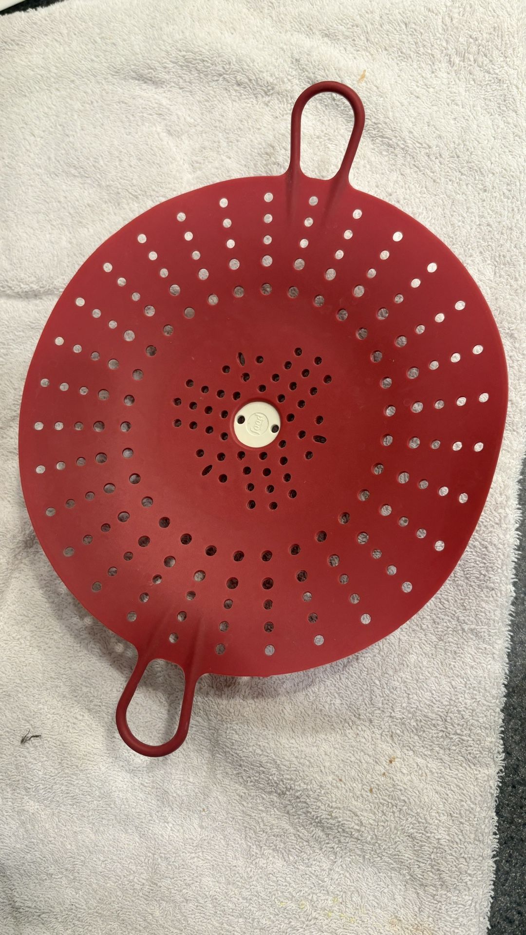 Silicone steamer made by the Food Network. It has a diameter of 8.5”. “Always use with water.”
