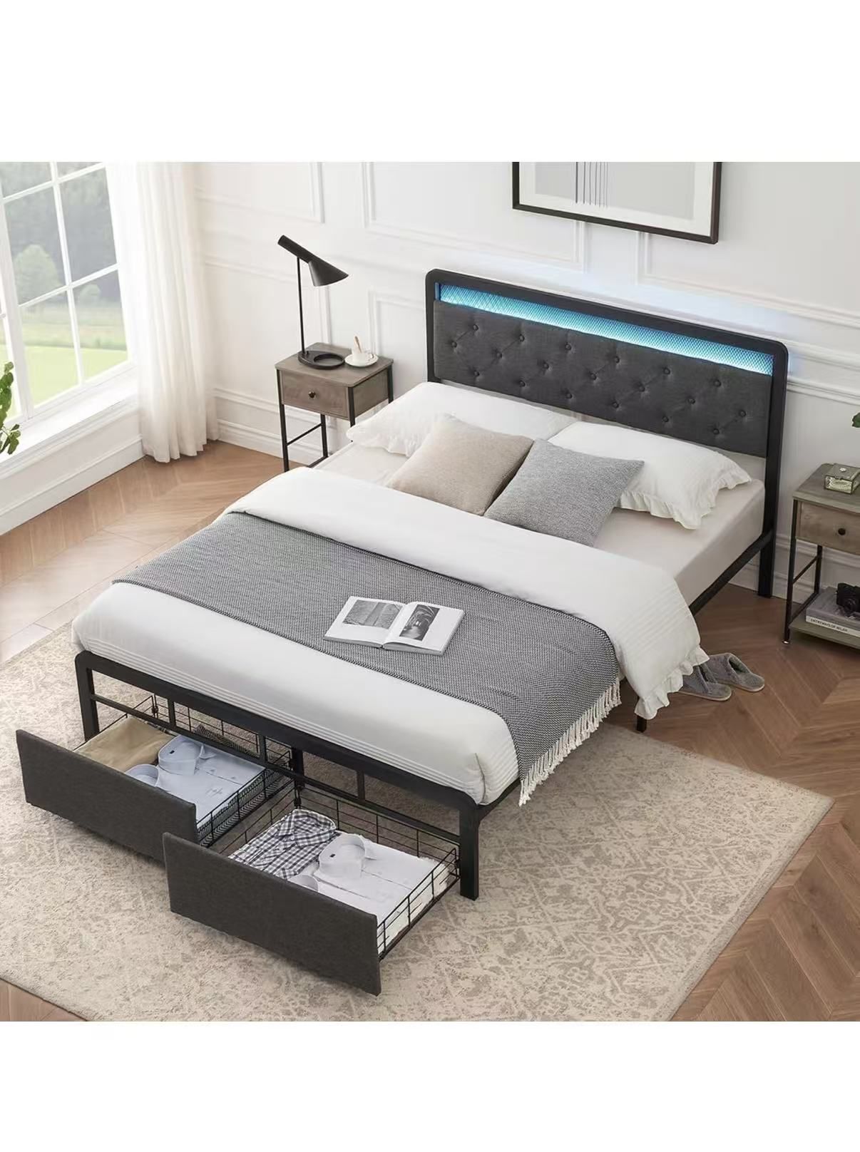 COMFORT AND STYLE DESIGN: This bed frame is expertly crafted with a linen-inspired smoke gray fabric finish, featuring elegant button tufting on the headboard for a contemporary touch. It seamlessly blends aesthetics and functionality, offering a high-density foam layer wrapped in breathable linen fabric to deliver plush and long-lasting support for your leisure activities like reading or watching TV. SPACIOUS STORAGE CAPACITY: Discover the convenience of our platform bed frame, complete with two storage drawers beneath. These drawers provide ample space to neatly organize your bedsheets, seasonal clothing, bedding, toys, and various items. Equipped with four wheels each, these drawers effortlessly glide open and closed, ensuring hassle-free access to your belongings. SMART LED BED FRAME: Elevate your bedroom experience with our storage bed frame, equipped with a built-in RGB LED light strip. This feature creates a relaxing ambiance for your evenings, offering 12 scene modes, 7 static colors, and 3 brightness levels. Effortlessly switch between various colors and lighting effects using the included remote controller or APP. What's more, the LED lights synchronize with the sound and music, adding a dynamic and entertaining element to your bedroom decor. STABLE & DURABLE CONSTRUCTION: Our queen size storage bed is expertly crafted with a strong metal frame, featuring 13 heavy-duty metal slats that are evenly spaced and supported by 9 legs. This construction greatly enhances the stability and durability of the platform bed, allowing it to withstand a weight capacity of up to 1100lbs. Additionally, an EVA sound absorbing strip is strategically placed along the center bar to prevent any noise from metal-on-metal rubbing, ensuring a peaceful and uninterrupted sleep. EFFORTLESS ASSEMBLY: This bed frame comes with detailed instruction, assembly tools and numbered parts, assembly can be done within 35 minutes. The assembly secret is not to tighten the screws right away until all parts coming together and then tighten.