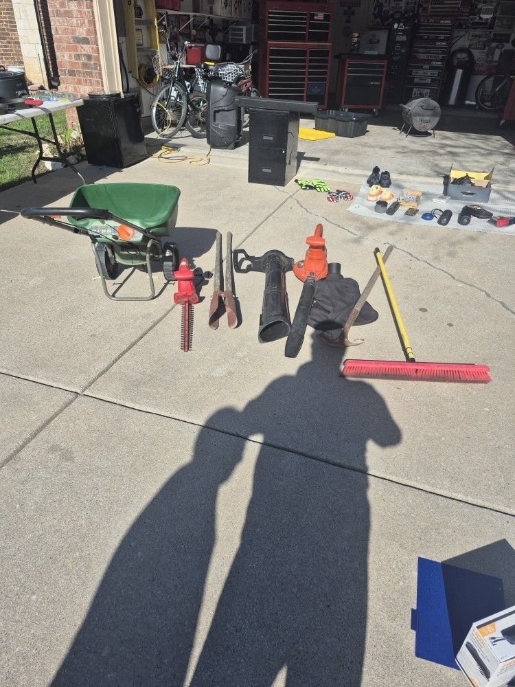 Garden and yard equipment in good conditions only the fertilized spreader cost almost a $100 in The Home Depot. The blower is blower in vacuum leafs At the same time. It's black and decker brand do you want to buy any items by separate?Let me know