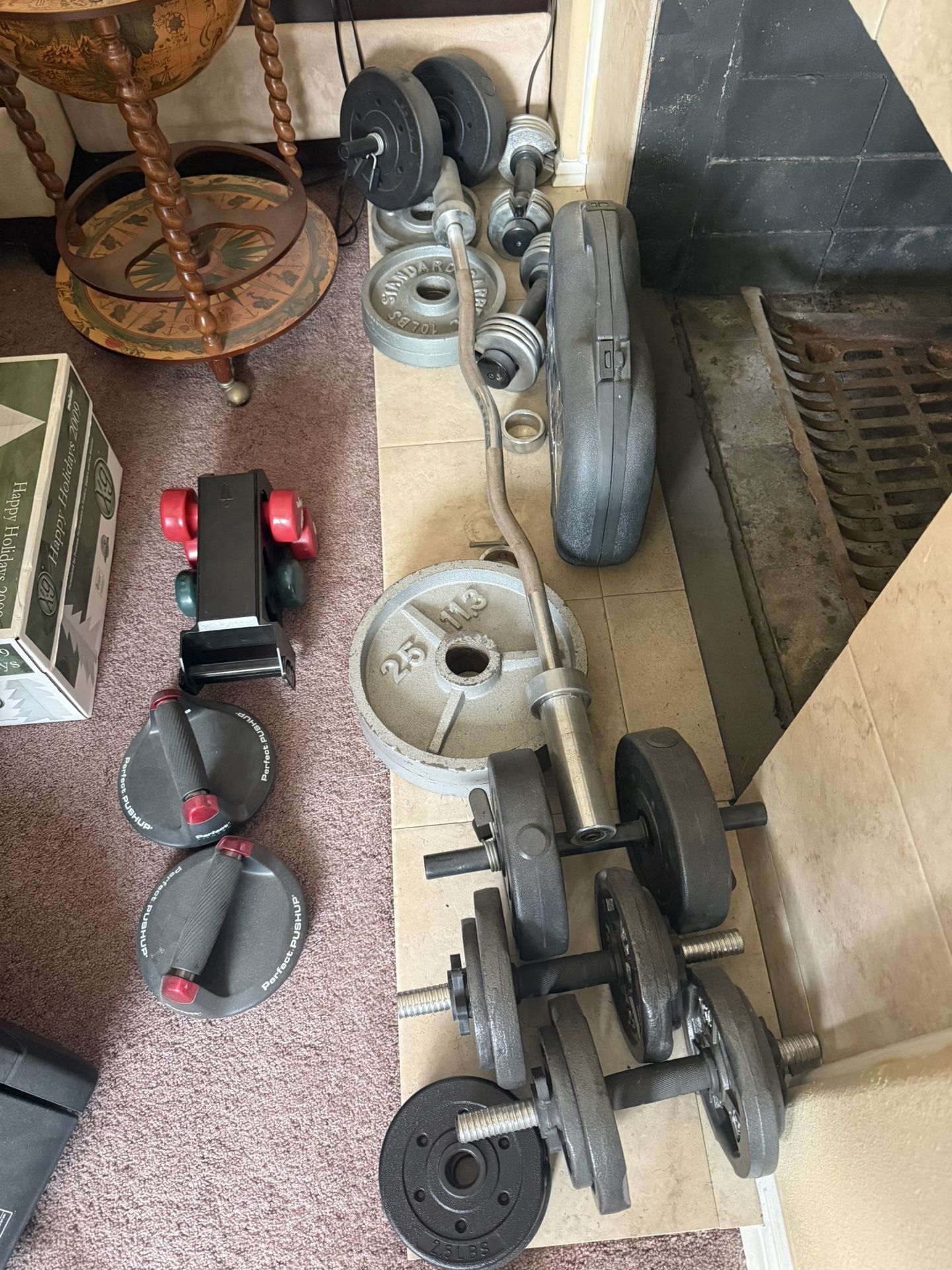 Less than $1 per lb EZ curl bar with clip : 25lbs x 2 10lbs x 2 5lbs x 2 3 sets of customizable dumbbells 1: 7.5lbs x4, 2.5lbs x4 2. 7.5lbs x 4, 2.5lbs x4 3. 1.5lbs x 16 2 push up stand with rotating handle Resistance bands Value over $400