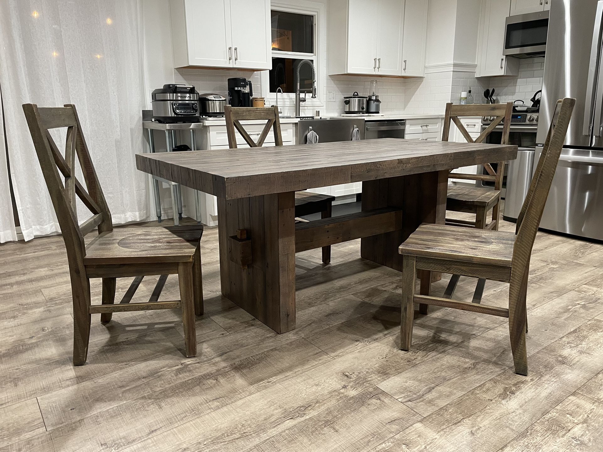 Reclaimed wood dining table with matching 4 chairs (72” x 39” x 31”). In Excellent Condition.