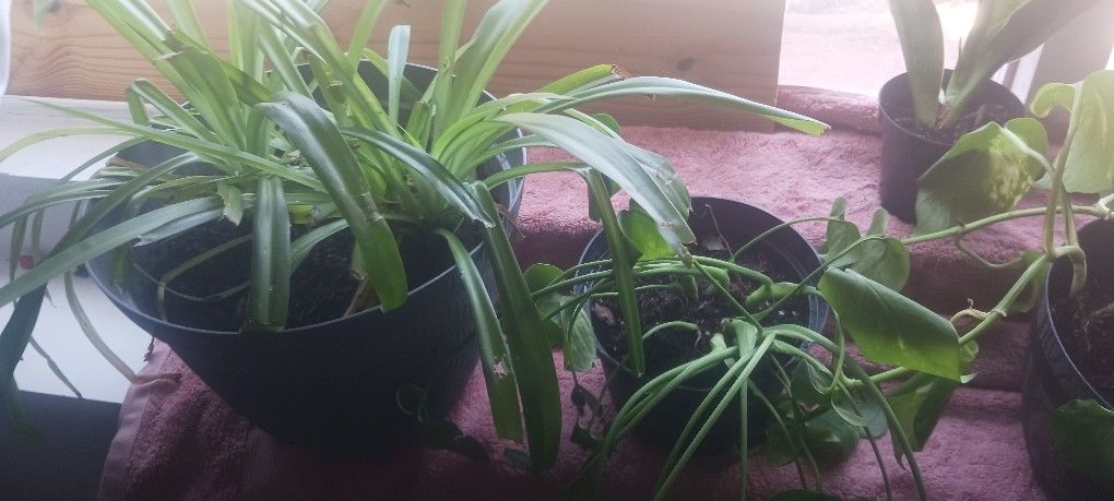 8 houseplants. 2 Pothos, 4 snake plant, 1 spider plant with 2 babies. 6 extra pots. Also have a large bag of potting soil I could throw in. $20 for all, will separate.