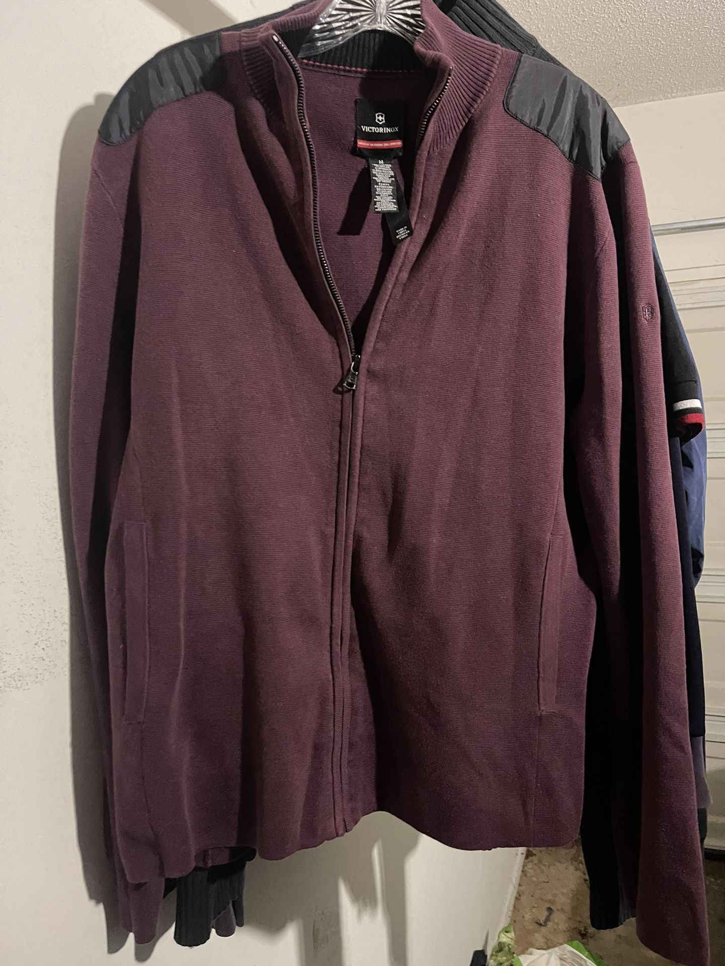 Victorinox Men’s Burgundy Zip Up Sweater w/blk Shldr Accents - slightly worn. Good condition. Size: L Black accents allows for more combinations of wear.