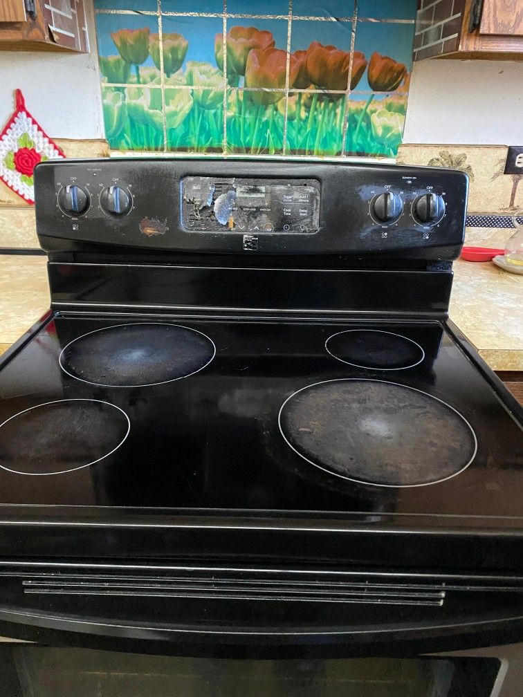 - 4 circles - Oven - Storage drawer - Model #:(contact info removed)3310 NOTE: THE GLASS TOP IS CRACKED Can easily fit in a SUV or a Minivan