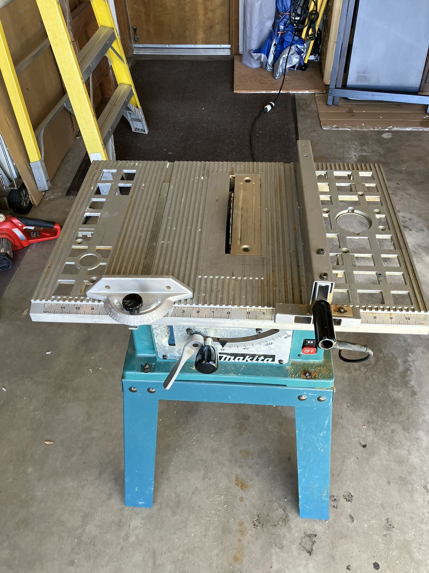 This saw was never commercially used. Was used only for small home projects. It is 4500 RPM with no load and 115 V AC. It comes with adjusting wrenches, side rail, guide, and push guide. It is also mounted on a steel stand. The blade is 8 1/4 inches in diameter and the arbor hole is 5/8 inch. It weighs 37.5 pounds. The table size is 26“ x 18 1/2 inches above the stand. It cuts 2 1/2 inches at 90° and one 5/8 inch at 45°.