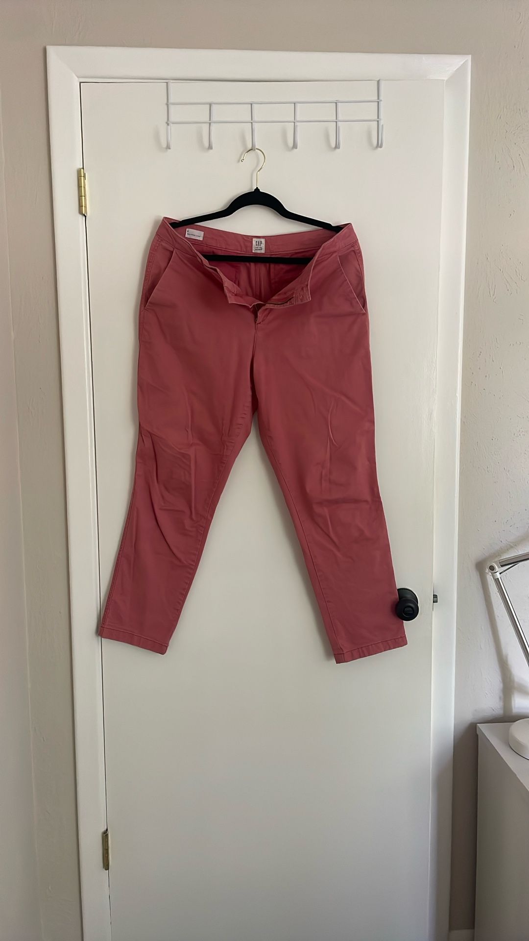 Fit: They embody the "girlfriend" chino style, offering a relaxed yet slightly more streamlined fit than a traditional "boyfriend" cut, typically tapering towards the ankle. Color & Material: The pants are a solid, muted pink color and made from a comfortable cotton blend, with a hint of stretch for comfort. Design Details: They feature a classic chino design with a mid-rise waist, a button closure and zip fly, front slant pockets, and rear welt pockets. The hem appears to be unrolled in the image, but this style often allows for a rolled hem for a cropped look. Versatility: Gap Girlfriend Chinos are known for their versatility, suitable for both casual and slightly more polished outfits, making them a wardrobe staple.