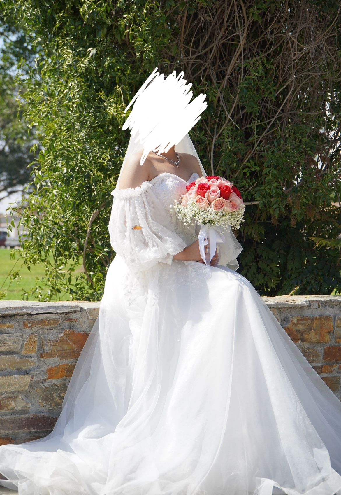 Gorgeous wedding gown can be worn off-shoulder or 3/4 sleeve. Corset style. Can fit 2-6 US dress size. It’s pretty long and unaltered. Im I’m 5’1 and was wearing 5” heels. Sorry I don’t have photos of the dress only.