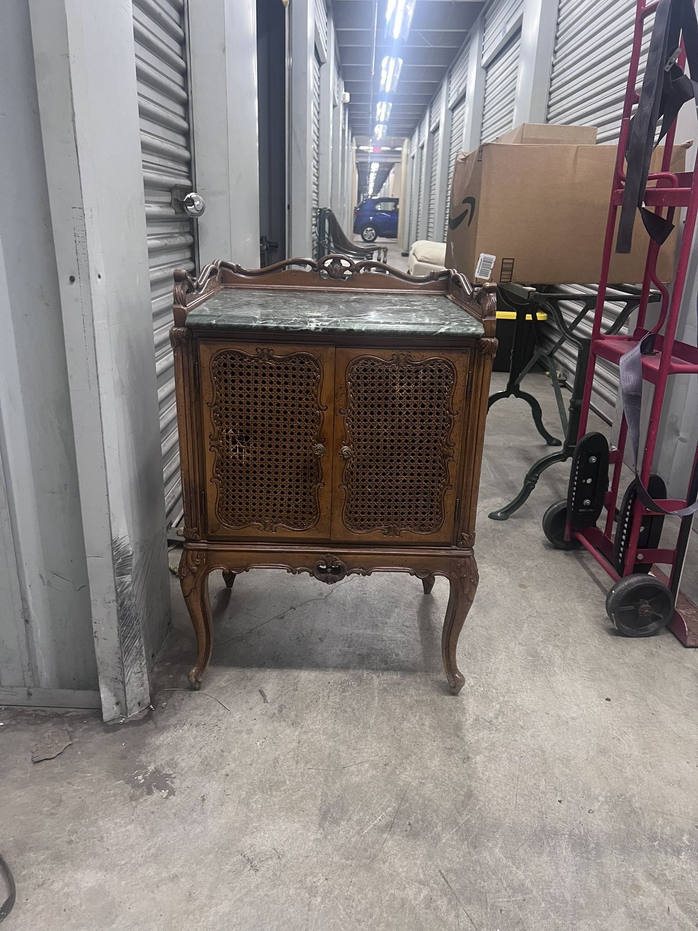 Side table with green stone top. Great for a mini bar. The cane on left door needs repair. $60