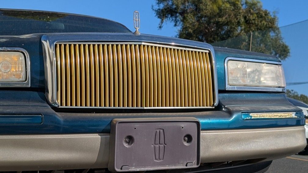 This is a custom gold grill for 95-97 Town Cars. It may possibly fit 90-94 as well. It is an original period aftermarket accessory, possibly by E&G. I will look at the back tomorrow and take better photos. This is the exact grill on the green car; the white is just for reference. The slats are all perfectly straight and the gold plating is consistent. This would look great on a custom lowrider application. Ornament included. $550